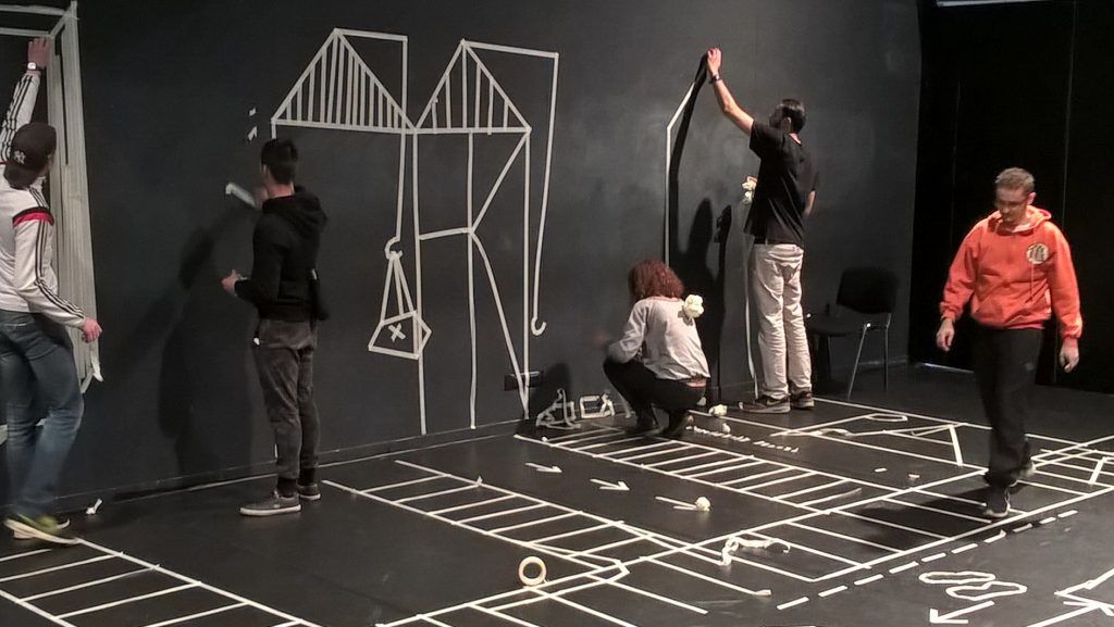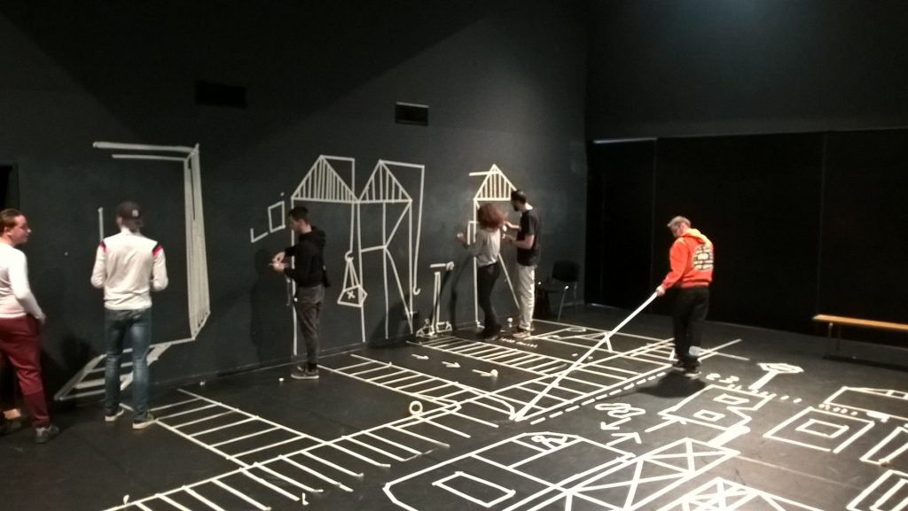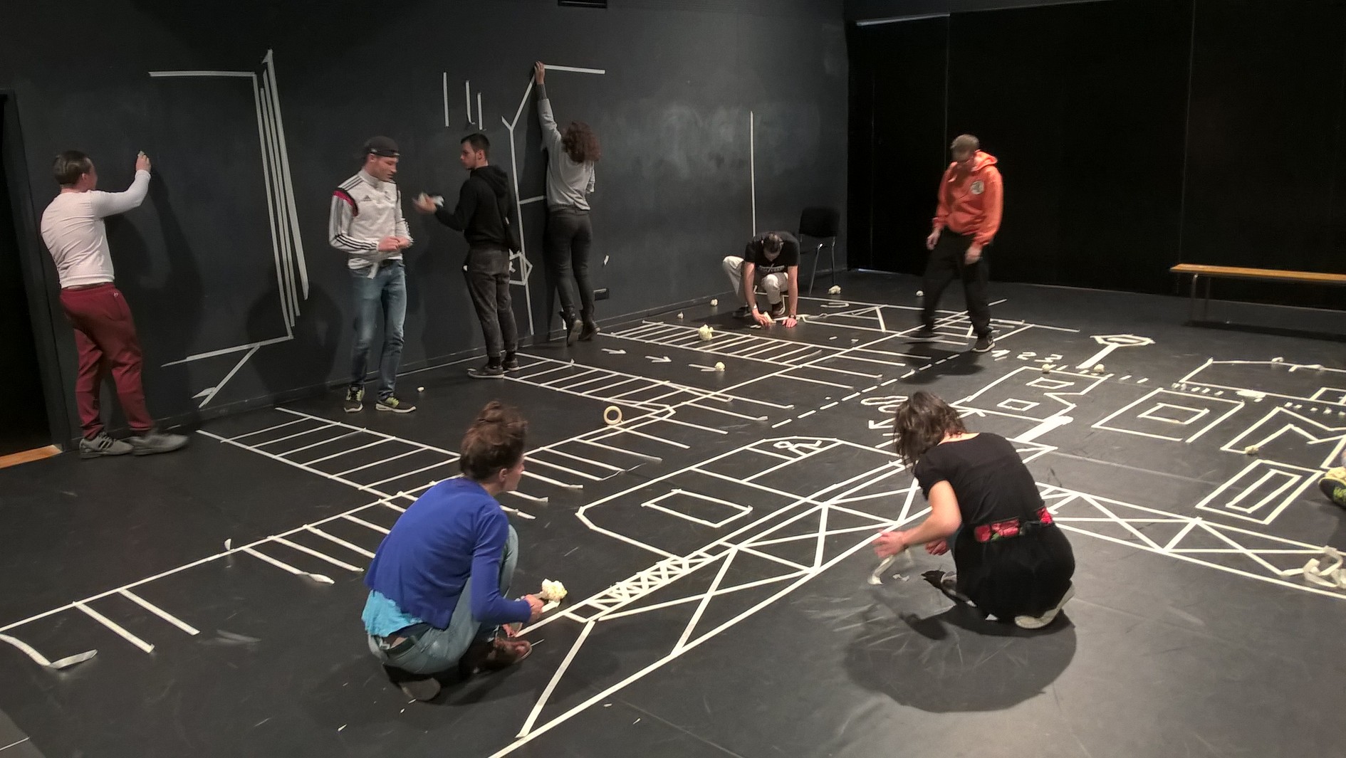 Rouleaux en main prêt à scotcher, scotcher le sol et le plafond, faire des rails, des tours, des tunnels, des flèches. Trois fois quatre minutes et le sol est recouvert d’un autre univers. On le construit en trois fois quatre minutes.
