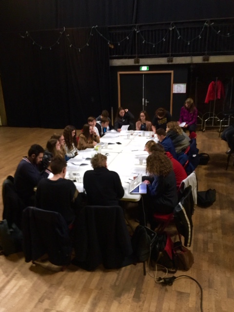 Retour à Loos-en-Gohelle. Tout le monde est au rendez-vous. Dès 10h, à l’arrivée des jeunes du CAJ d’Annequin, on se met à la table, pour travailler sur les textes et répartir les interventions de chacun dans les séquences du futur film-spectacle. À 10h30, on s’aperçoit qu’on n’a pas pris le temps de boire un café ou un jus de fruit pour fêter la reprise et le premier jour de cette deuxième semaine (après celle du 11 au 16 février), alors on fait une petite pause, mais on se remet vite au travail. Tout le monde est impatient de retrouver les textes. On lit, on parle beaucoup, on explique aux « quinze d’Annequin » comment va se passer cette semaine, ça va aller vite jusqu’à vendredi. Tout le monde est sérieux. Vers 11h, on leur précise : « Si vous avez des questions, n’hésitez pas ! » Et là, il y a juste une petite voix pour dire : « On n’a pas de question, c’est parce qu’on comprend vite. » Et le travail reprend. À table, jusqu’à l’heure du déjeuner.