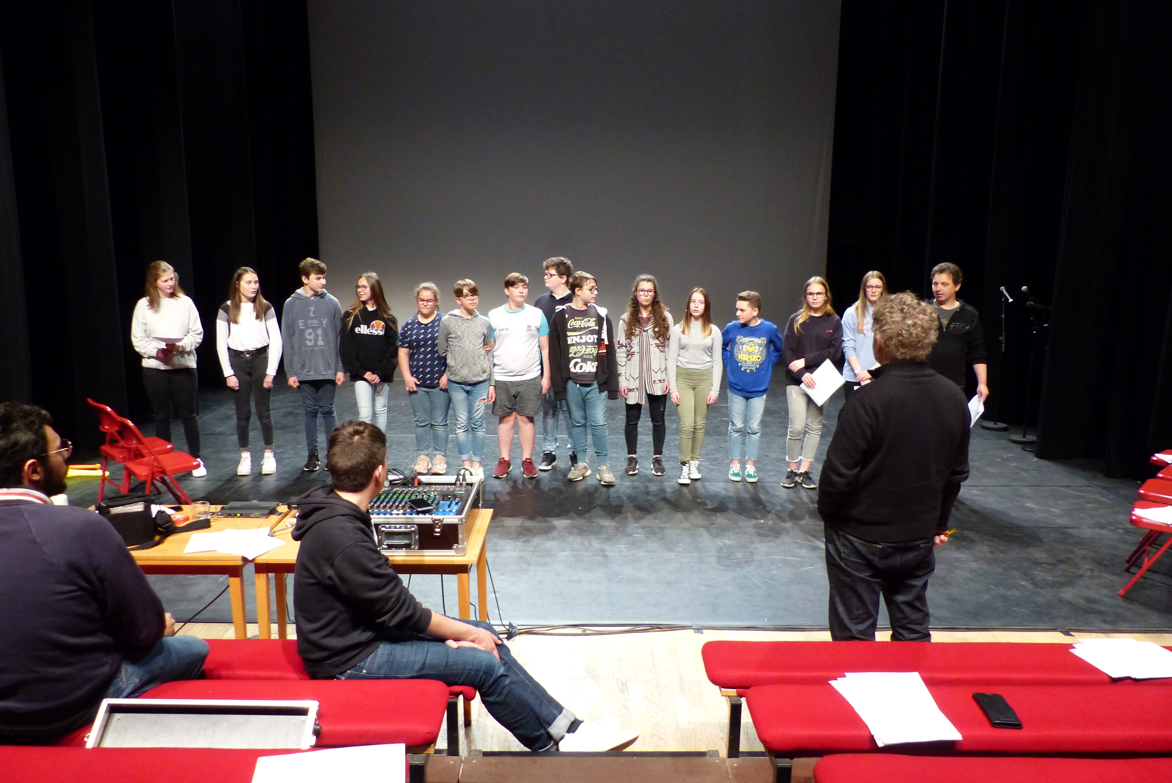 Une séquence du film-spectacle Close To Me à Culture Commune. Pendant la première semaine de travail, en février, à propos du vivre ensemble, les jeunes s’étaient prêtés à plusieurs ateliers d’écriture. Et notamment, ils avaient répondu à la question : Qu’est-ce que vous ne supportez pas ? Et pourquoi ? Là, sur le plateau, pour cette séquence, ils sont en ligne, partent du fond et avancent quand ils parlent. Ça, ça va. Ce qu’ils trouvent plus déstabilisant, c’est qu’on n’a pas fixé l’ordre pour les prises de paroles. Alors, il faut être à l’écoute, ne pas partir à deux en même temps, ne pas laisser de blanc, faire avancer la ligne au fur et à mesure des 45 interventions. En voici quelques unes :