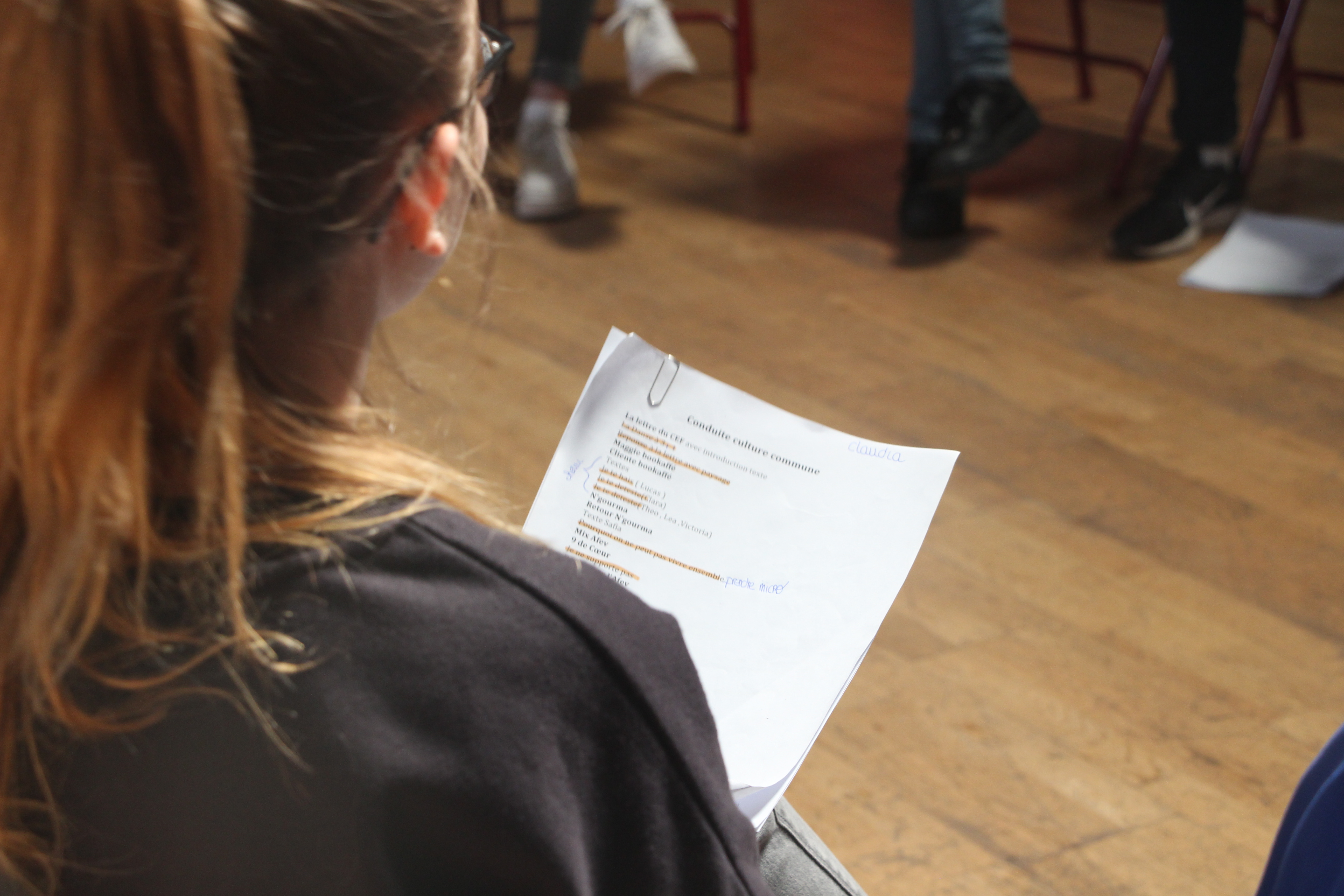 Avec les jeunes du CAJ d’Annequin, on reste dans la Nef pour répéter et on se concentre sur l’apprentissage des textes, l’articulation, les intentions, les enchaînements, les directions dans l’espace, l’adresse.