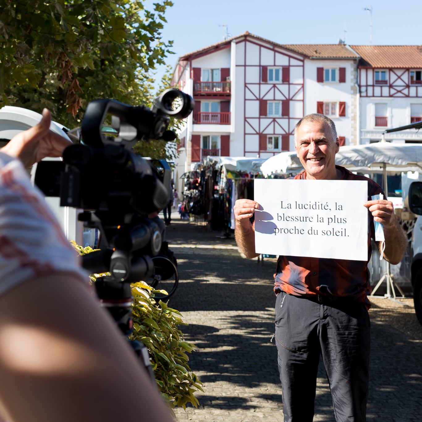 Les Portraits-Citations. Pour une séquence du film-spectacle. Un protocole qu’on filme sur le marché de Saint-Palais, ce vendredi, premier jour de notre présence dans la Capitale de l’Amikuze, dans le Pays Basque (Nord), en Basse-Navarre.
