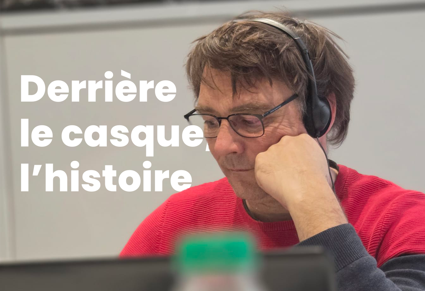 Thomas écoute avec cette concentration tranquille qui lui est propre, le menton posé dans la main, les yeux légèrement plissés derrière ses lunettes. On dirait qu’il ne se contente pas d’entendre: il traverse les mots, il les suit jusqu’à ce qu’ils retrouvent leur place. Le casque posé sur ses oreilles n’est pas un outil, mais un passage. Ce qu’il capte ne passe pas seulement dans sa tête, mais dans une zone plus profonde, celle où le récit commence à respirer.