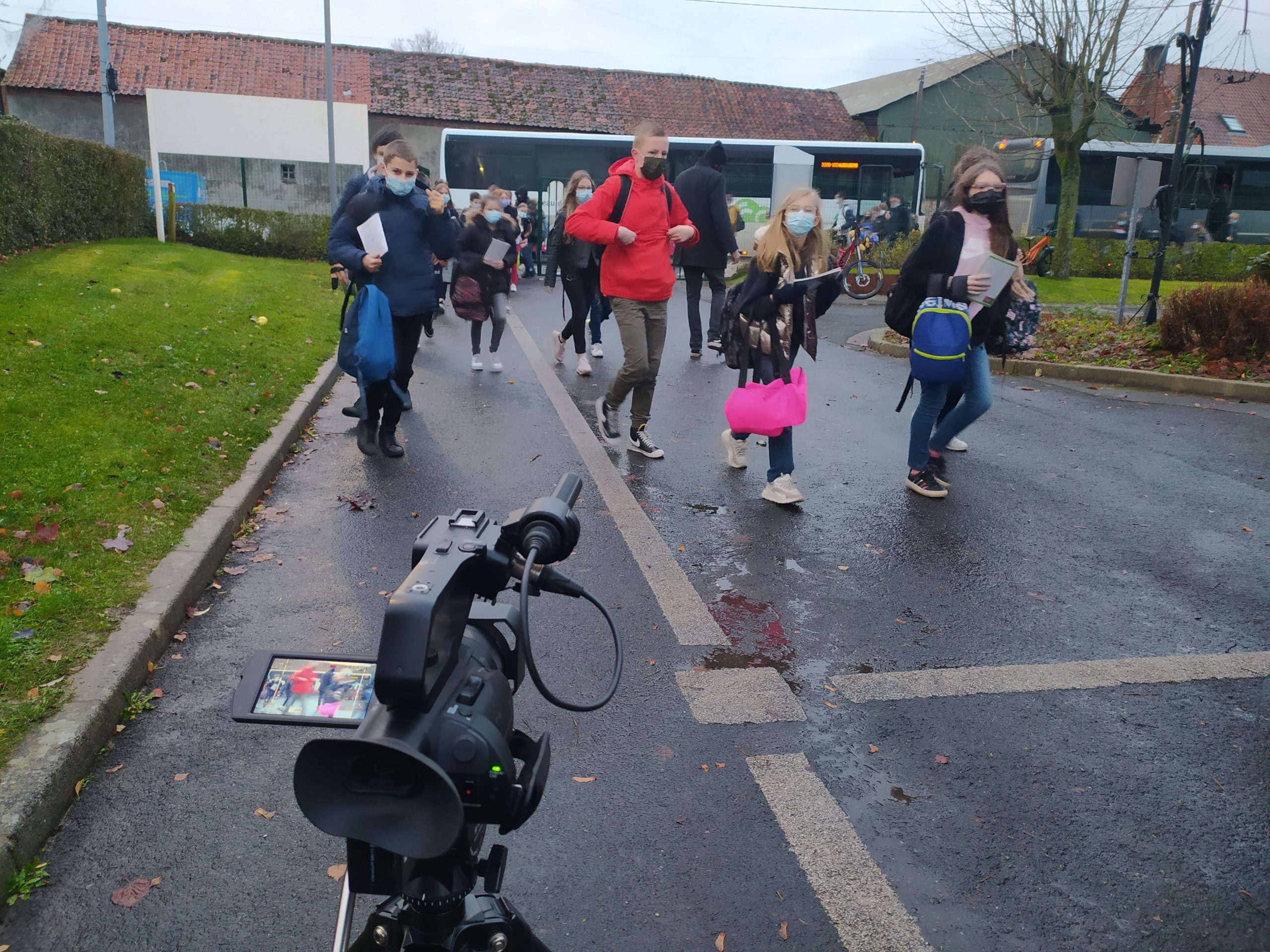 On s’est rendu compte qu’en classe c’était pas toujours calme, et on se doute que les profs trouvent pas le bruit toujours sympa. Dans la classe il y a ceux qu’on entend et qu’on voit de suite, puis ceux qui sont plus discrets, mais la quasi-majorité a bien envie de participer à notre film. On a retenu plein de prénoms, peut-être pas tous, mais c’est toujours chouette de pouvoir dire « Bonjour Maëlle ou bonjour Maël » si l’on croise l’un ou l’une des trois Maëlle / Maël de la 3ème B. Il y aussi Zoé, Gabriel, Lilian, Gwenaël, Lou, Lilou, Tristan, Yanis, Lucas, Mathéo et Mathéo, Maureen, Anabelle et Anaëlle, Clovis, Léane, Kylliane, Eva, Elsa, Raphaël, Kiméo, Clara, Julien, Eglantine, Marie, Marie, Marie-Sarah, Faustine, Maëlys et Maëlys, Noam, Noam et Noah, Simon, Bryan, Ryan, Eva, Léa… et presque 270 autres, alors ça serait un peu long de tous les citer ici !