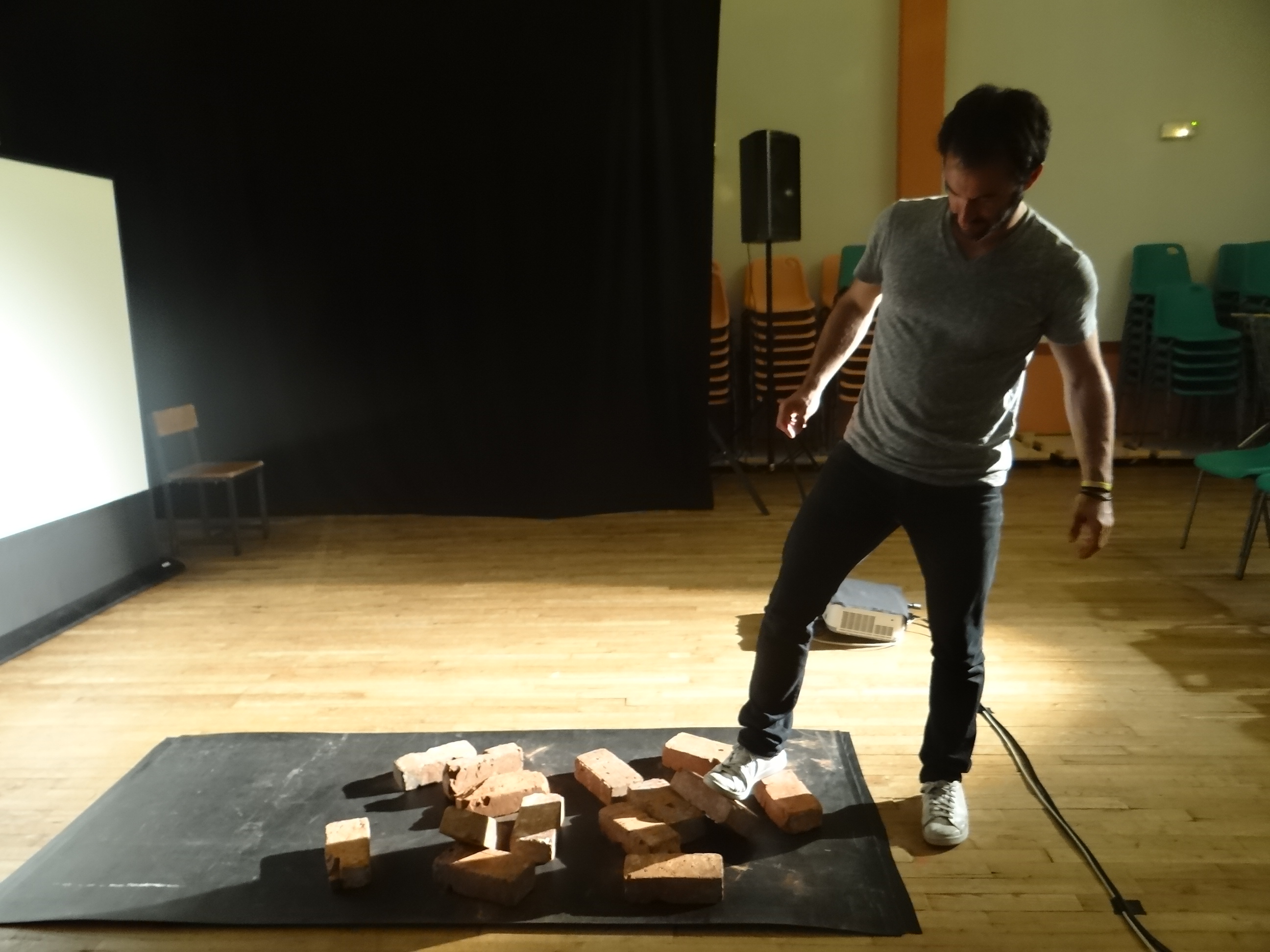 La sale Evasion a accueilli la Brique. Deux heures de route depuis l’étape précédente. On a distribué des tracts avant la représentation pour inciter les gens à nous rejoindre au spectacle. C’est toujours l’occasion d’une petite conversation. Lucas, l’animateur CCAS a bien voulu nous prêter son micro après une animation sur la place du village. On a fait un petit speech pour faire venir les gens. Et après le spectacle, on a organisé (comme à Onnion) une discussion avec le public. Agréable. Après on a démonté le décor. Tous ensemble. Nous quatre (Marie, Chistophe, Jérémie et Guy). On fera ça tous les soirs, ça permet d’accélérer le démontage et ça décharge Jérémie et Christophe de une heure à deux heures de boulot. Comme on est complètement livré à nous mêmes, la collaboration technique est indispensable. Christophe a repris les commandes de la régie lumière et se débrouille comme un chef. Les journées sont longues. On a démarré à 9H30 et on termine à 00H30.