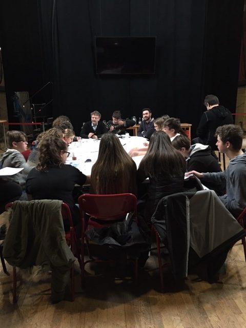Retour à Loos-en-Gohelle. Tout le monde est au rendez-vous. Dès 10h, à l’arrivée des jeunes du CAJ d’Annequin, on se met à la table, pour travailler sur les textes et répartir les interventions de chacun dans les séquences du futur film-spectacle. À 10h30, on s’aperçoit qu’on n’a pas pris le temps de boire un café ou un jus de fruit pour fêter la reprise et le premier jour de cette deuxième semaine (après celle du 11 au 16 février), alors on fait une petite pause, mais on se remet vite au travail. Tout le monde est impatient de retrouver les textes. On lit, on parle beaucoup, on explique aux « quinze d’Annequin » comment va se passer cette semaine, ça va aller vite jusqu’à vendredi. Tout le monde est sérieux. Vers 11h, on leur précise : « Si vous avez des questions, n’hésitez pas ! » Et là, il y a juste une petite voix pour dire : « On n’a pas de question, c’est parce qu’on comprend vite. » Et le travail reprend. À table, jusqu’à l’heure du déjeuner.