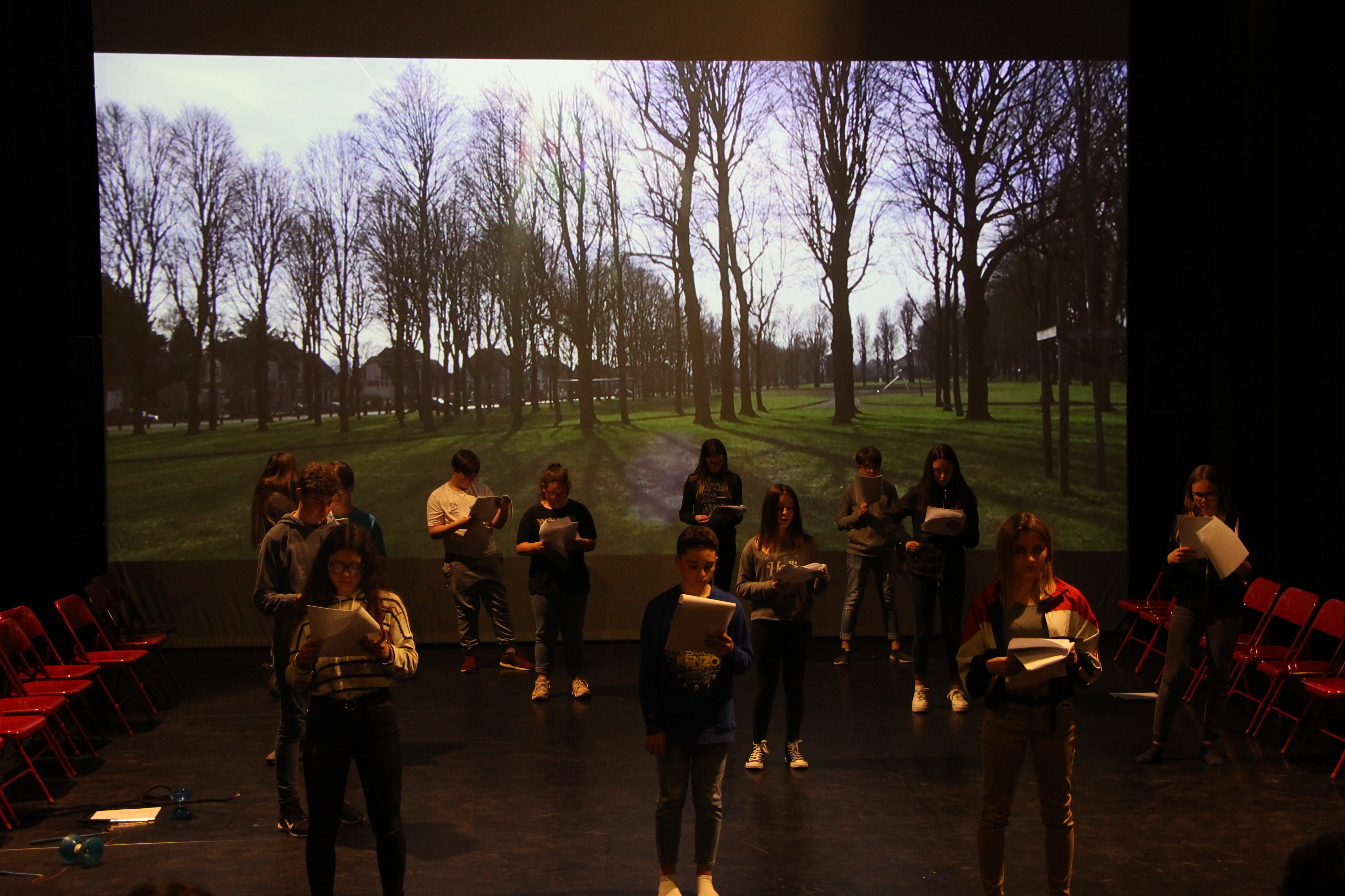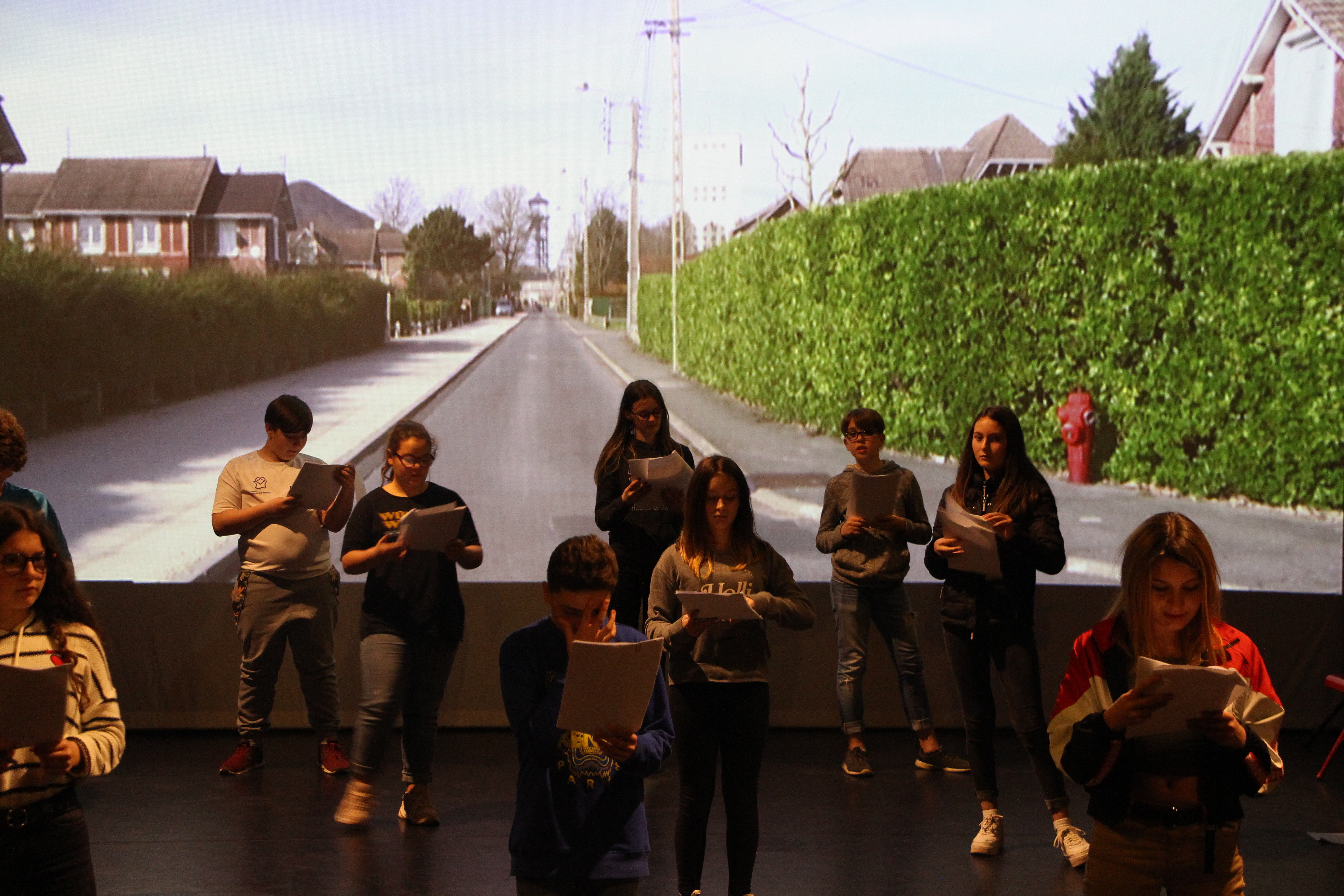 Après le travail à la table du matin avec les textes, l’après-midi est le moment de la première répétition sur la plateau. On déroule tout dans l’ordre, vidéos, textes, danses, pour avoir une vision d’ensemble. Ensuite, on prend un temps pour revenir sur la danse de la fin. Les textes on y reviendra demain, il faut d’abord que chacun puisse avoir un peu de temps (ce soir à la maison) pour les apprendre. Mais quand la journée est finie, même si tout le monde est fatigué, les quinze jeunes du CAJ d’Annequin demandent à rester encore un peu, ils aimeraient revoir la vidéo qui avait été tournée sur le terril. Alors, on rallume le vidéo-projecteur et tout le monde se rassoit pour regarder. Et puis hop, fin de journée, il faut bien. À demain. Le film-spectacle Close-To-Me-Culture-Commune, c’est à Loos-en-Gohelle, ce vendredi 12 avril (faudra être prêts). Ça jouera deux fois, à 16h et à 20h.