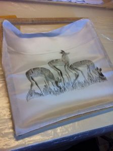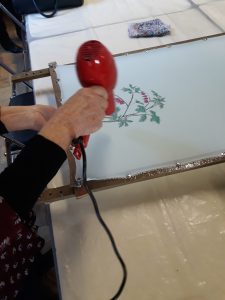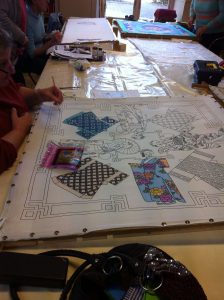 Sur les conseils de Claudine, rencontrée mercredi dernier à la médiathèque, nous avons rencontré tout à l’heure les Doigts Agiles, un groupe de femmes qui peignent sur la soie. Certaines peignent dans des motifs pré-existants, d’autres se lancent carrément dans des dessins originaux à base de bâtons d’encre de chine. Nous sommes attendu.e.s et proposons le protocole des citations. Malgré quelques taquineries, l’ambiance est joviale et l’accueil chaleureux.