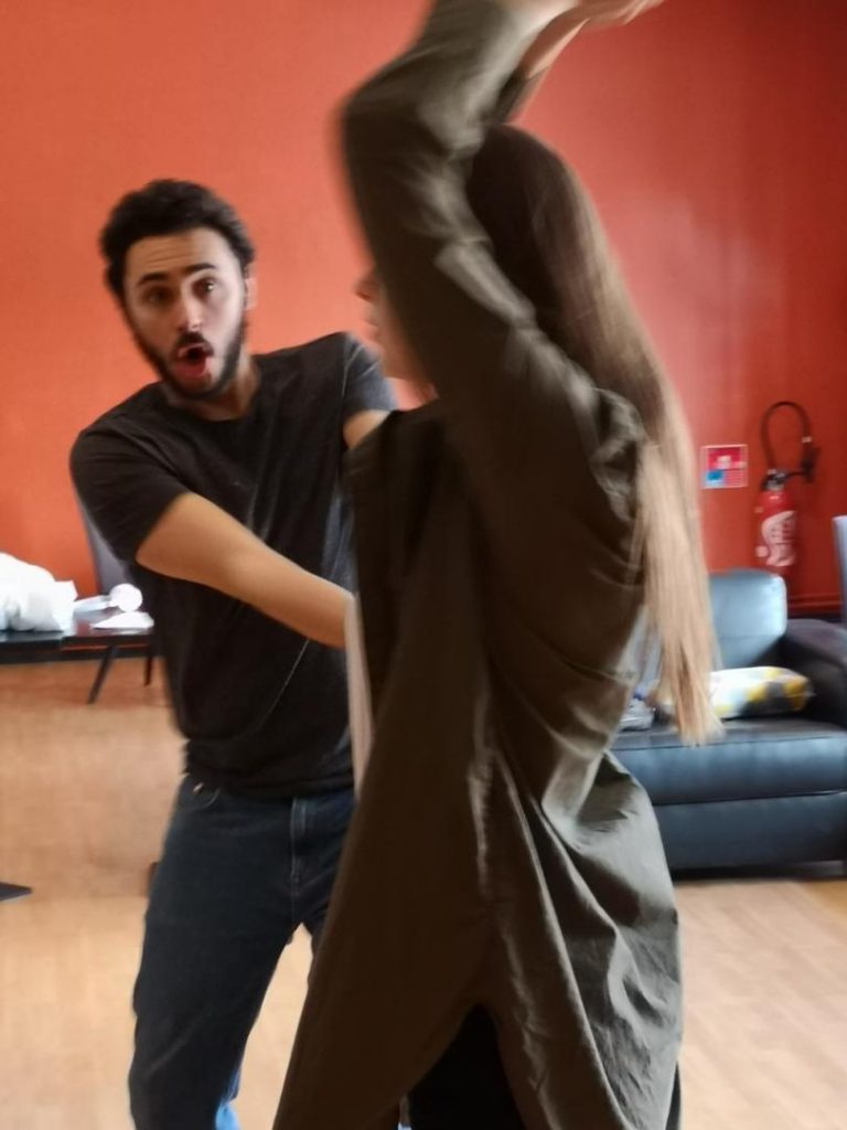 Ce matin, sur le plateau, dans la salle Molière de l’Espace Jean Legendre, c’est le montage des projecteurs, pour vendredi. Ce matin, on n’a pas sur le plateau pour répéter, mais ça n’est pas un problème, on répète dans tous les coins de l’Espace Jean Legendre :