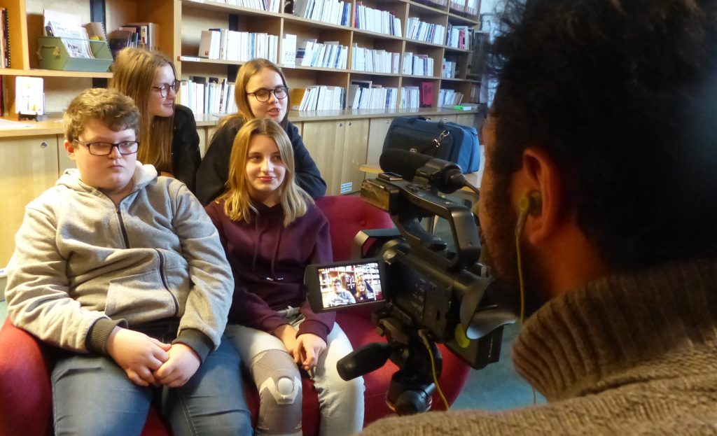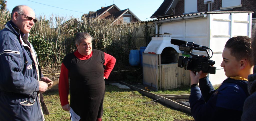 À 14h donc, on arrive au Bookkafé de Maggie, et là, surprise pour les jeunes du CAJ, deux personnes ont déjeuné là et sont en train de partir, et l’une d’elle est la prof documentaliste du collège de Vermelles, tout précisément le collège de Lauryne, Claudia, Théo et Alexandra. Oh, Madame, bonjour. Timidité et gêne d’abord chez les jeunes redevenus d’un seul coup élèves. Puis, finalement, ils parlent avec la « prof » et osent demander une interview. La prof, en fait elle s’appelle Bérangère et elle ne partira pas tout de suite, on va filmer la « prof documentaliste » qui a accepté de répondre à la question du vivre-ensemble. C’est comme ça qu’on apprend que, en dehors d’être venue aujourd’hui vendredi déjeuner au Bookkafé, Bérangère y travaille tous les mercredis midi, en tant que serveuse bénévole.