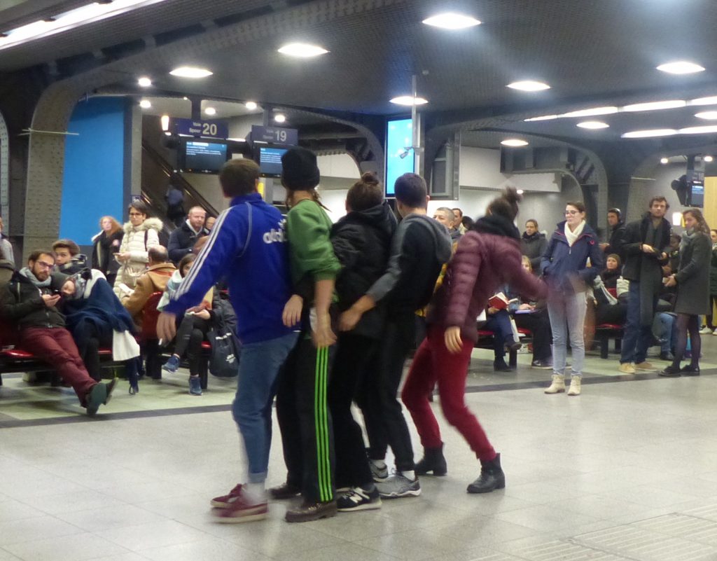 On n’a pas pu y rester longtemps aujourd’hui. Il y a trois jours, lundi, on avait dansé un bon moment à la gare de Bruxelles-Midi, avec les acro-danseurs de Cirqu’Conflex. Mais là, des policiers sont venus trop vite nous dire que sans autorisation, c’est non. On y a changé d’endroit et on a dansé encore, un petit peu.