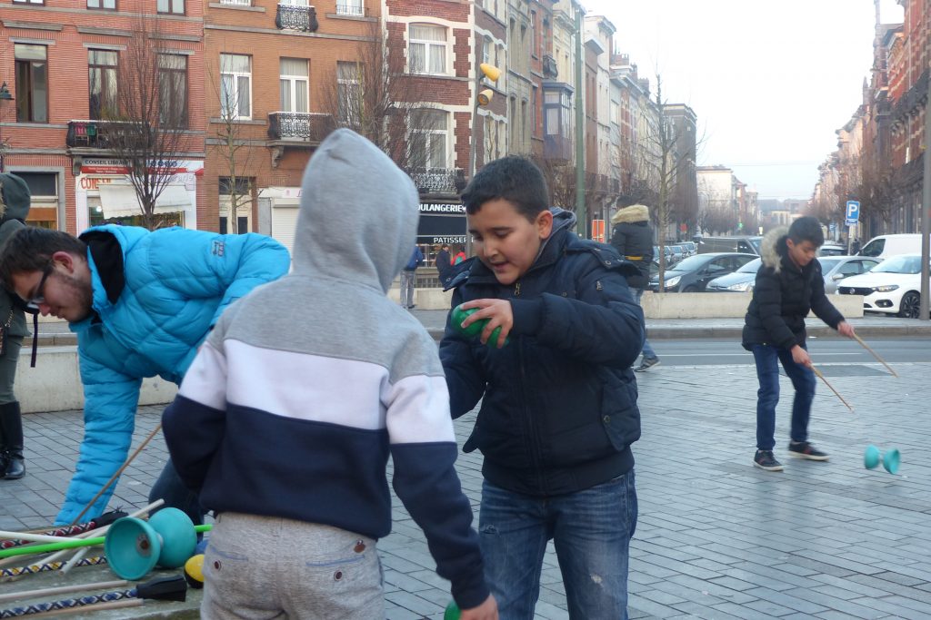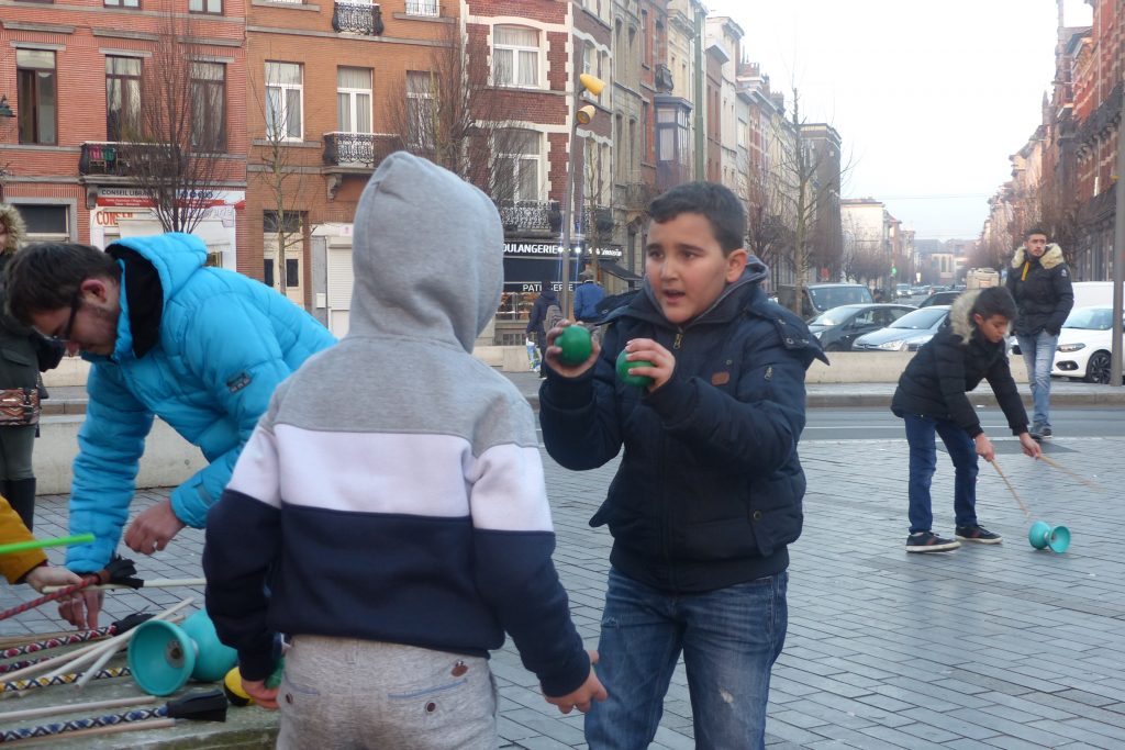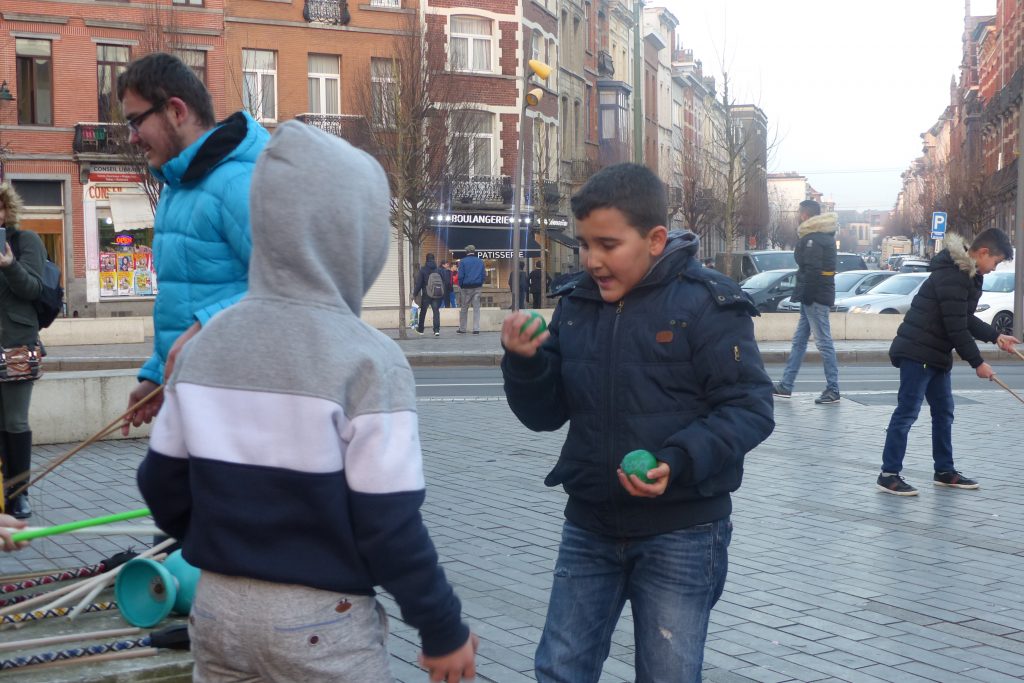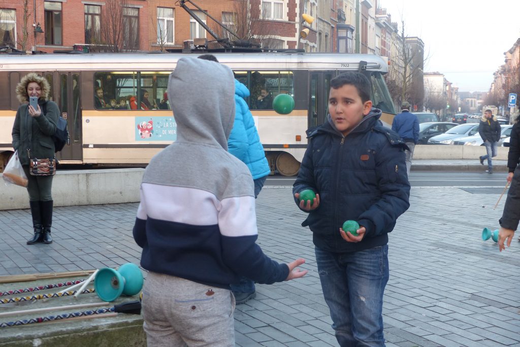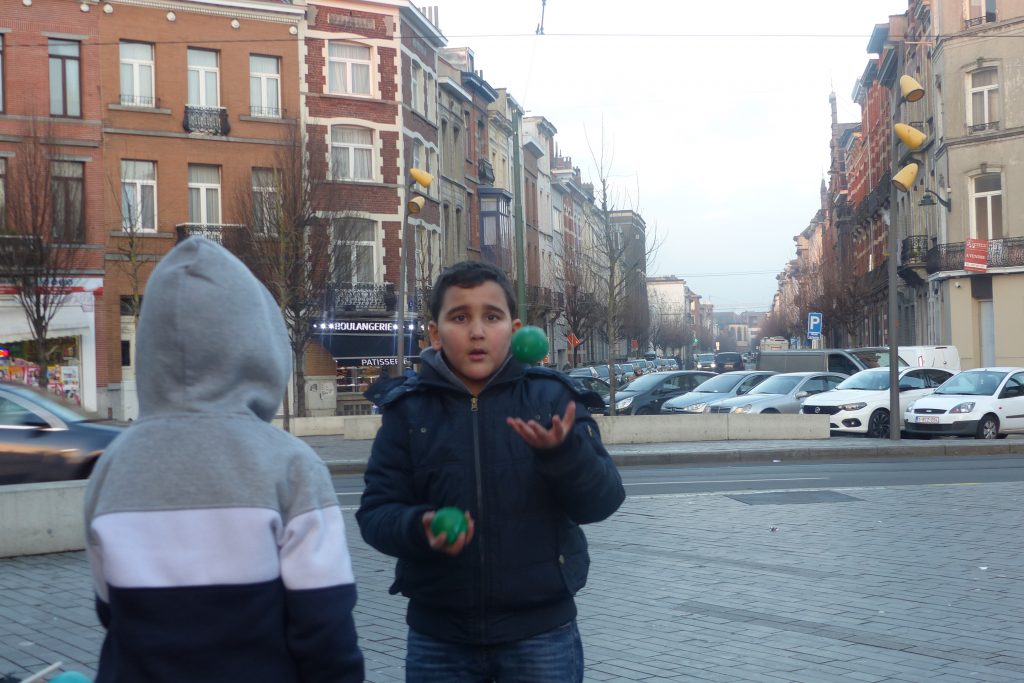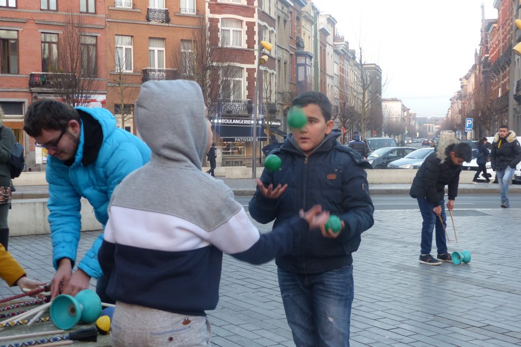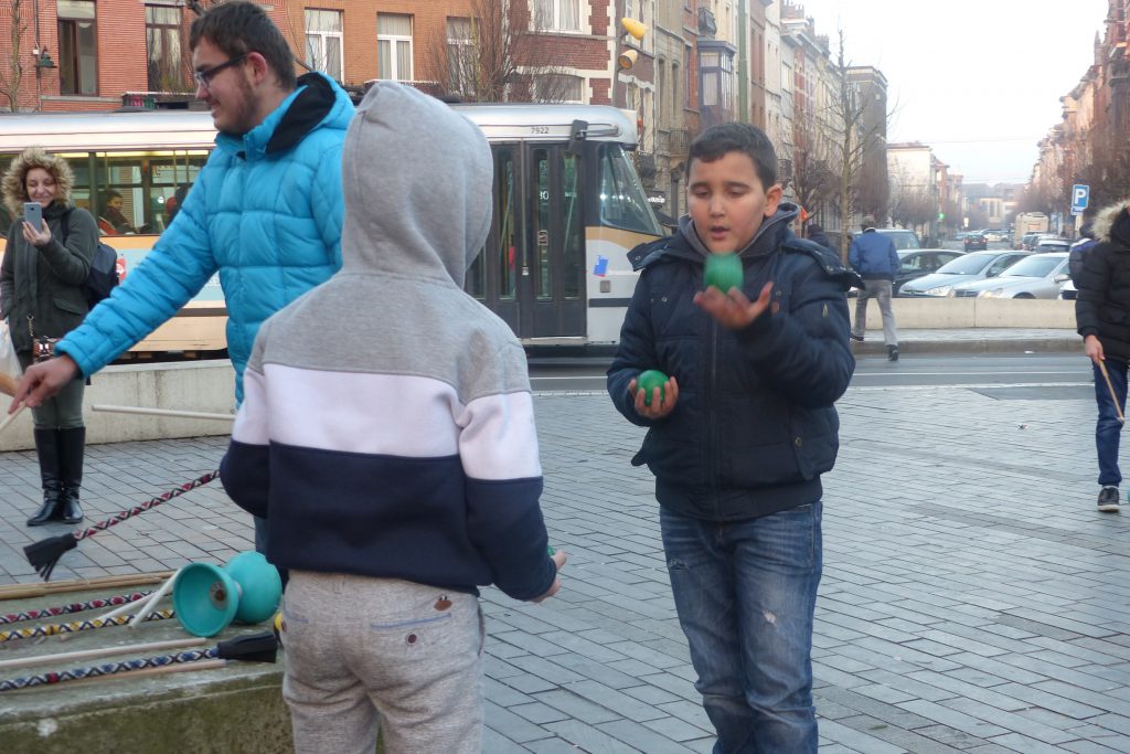 On était dehors pour jongler et faire essayer le jonglage aux gens qui passaient devant la Maison Communale d’Anderlecht. Un enfant du quartier viendra, prendra des balles et restera longtemps avec nous. Ce garçon est très vite sous l’aile d’Assad qui a envie de transmettre. Assad est un jeune jongleur très doué du groupe multi-cirque du mercredi après-midi à Cirqu’Conflex. Il va tout expliquer, tout montrer, autant de fois que nécessaire : tu devrais lancer comme ça, tu devrais mettre ta main comme ça, c’est au moment où cette balle-là est en haut que tu lances celle-ci. Assad, avec une grande patience, beaucoup d’attention et beaucoup d’envie, fait tout pour que ce nouveau jongleur y arrive aussi.