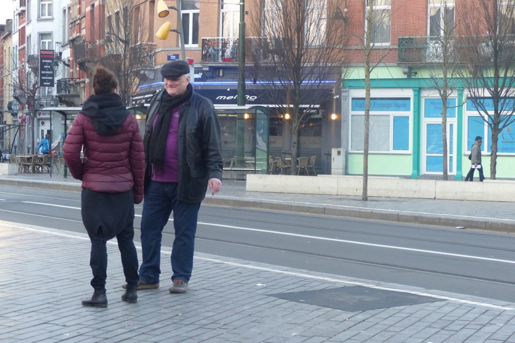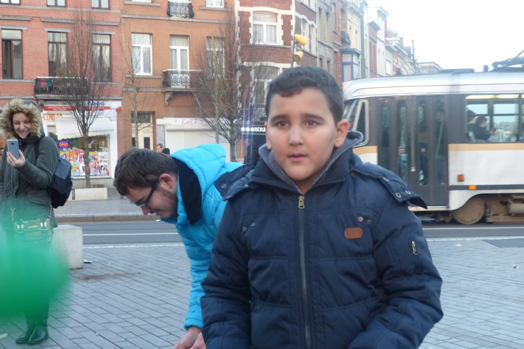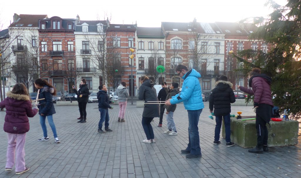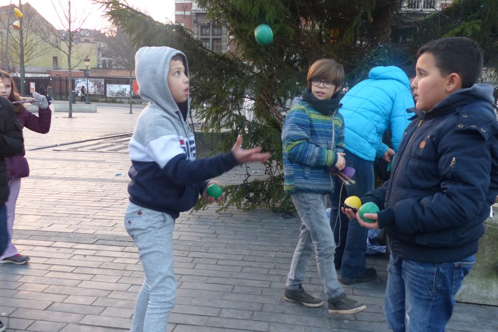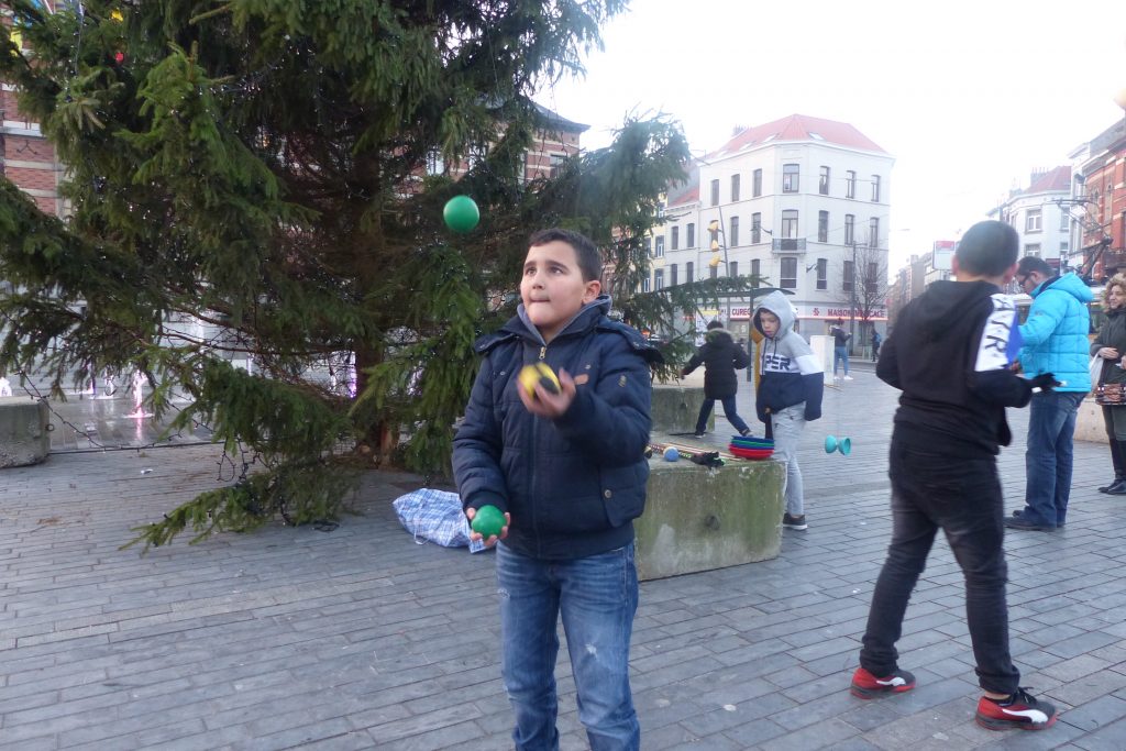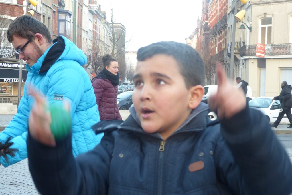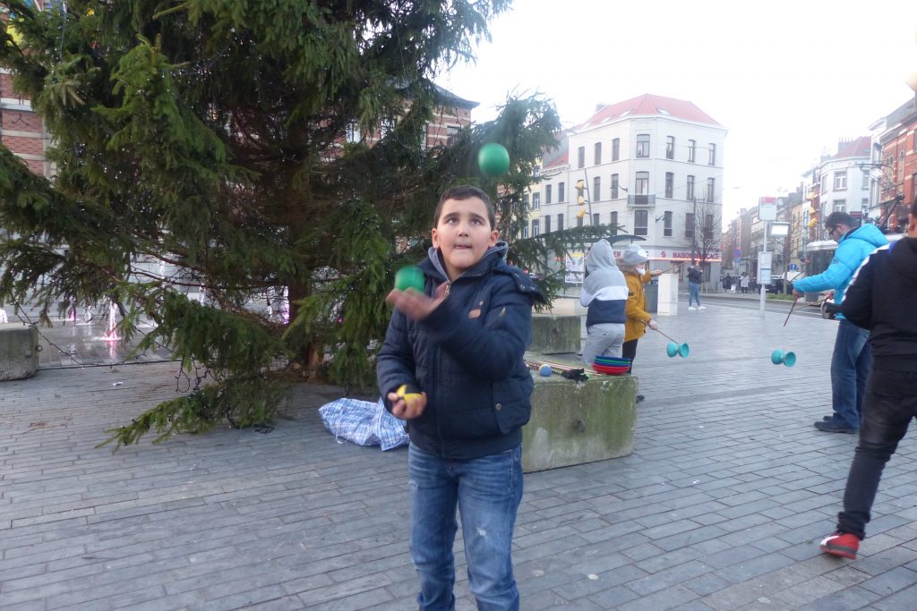 On était dehors pour jongler et faire essayer le jonglage aux gens qui passaient devant la Maison Communale d’Anderlecht. Un enfant du quartier viendra, prendra des balles et restera longtemps avec nous. Ce garçon est très vite sous l’aile d’Assad qui a envie de transmettre. Assad est un jeune jongleur très doué du groupe multi-cirque du mercredi après-midi à Cirqu’Conflex. Il va tout expliquer, tout montrer, autant de fois que nécessaire : tu devrais lancer comme ça, tu devrais mettre ta main comme ça, c’est au moment où cette balle-là est en haut que tu lances celle-ci. Assad, avec une grande patience, beaucoup d’attention et beaucoup d’envie, fait tout pour que ce nouveau jongleur y arrive aussi.