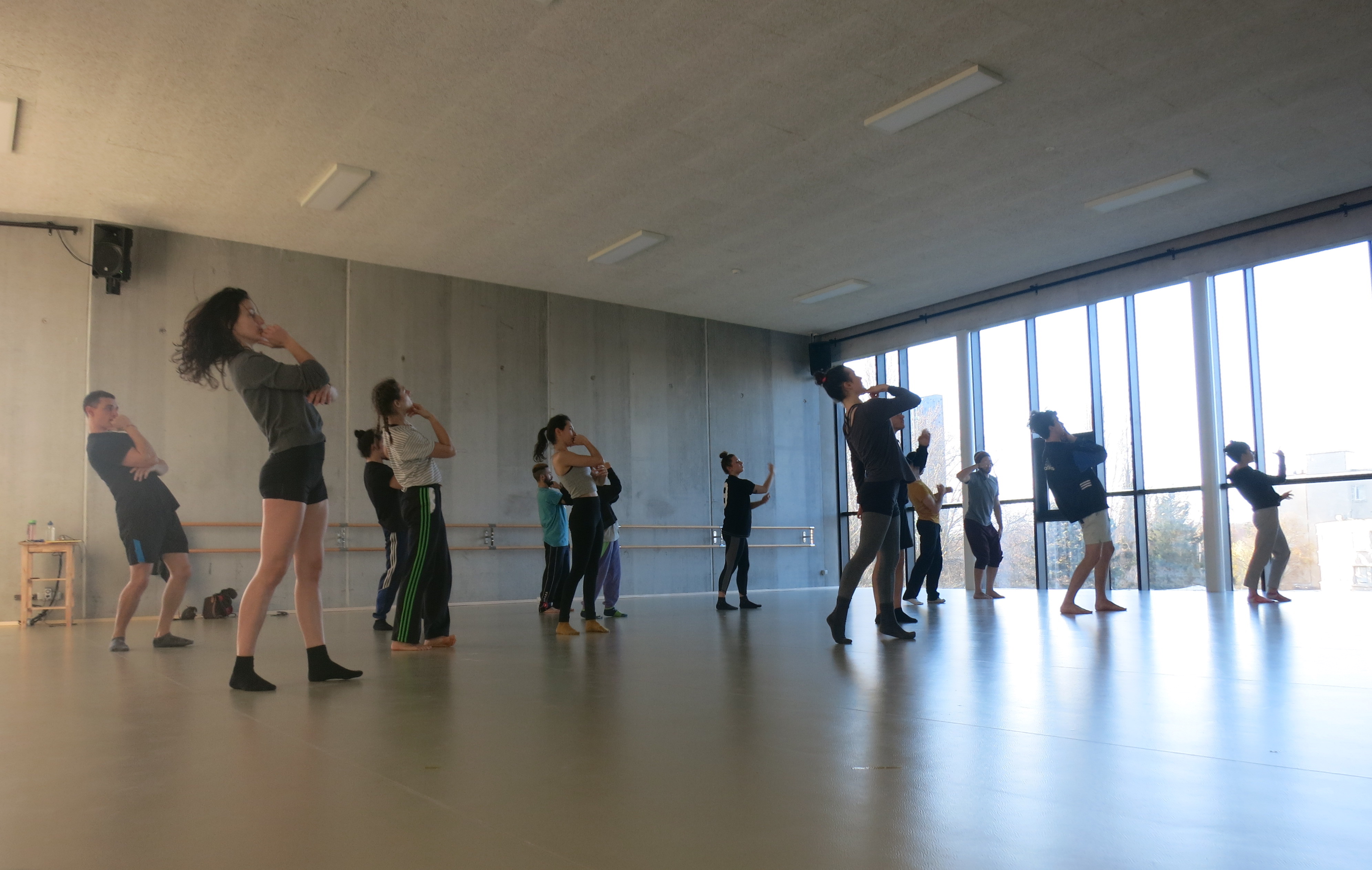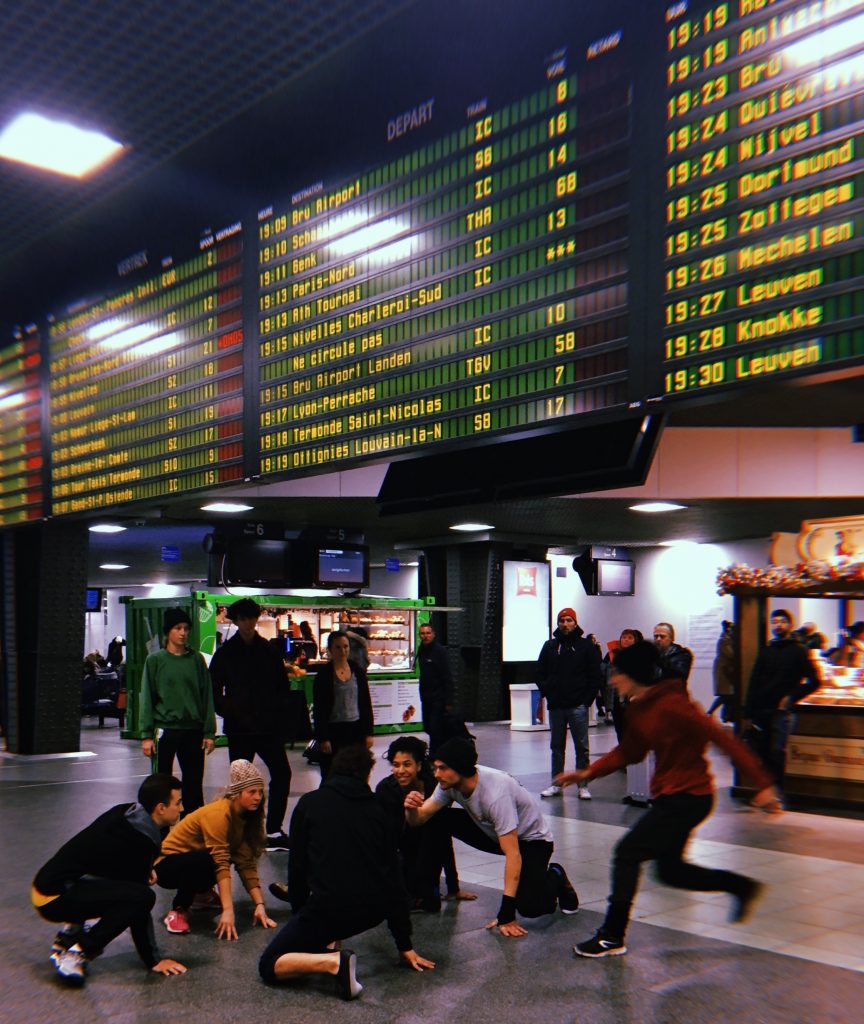 Les 15 étudiants de l’ESAC rejoignent le groupe acro-danse de Cirqu’conflex. Tiki amène tout le monde, petit à petit, dans un mode de fonctionnement et dans des codes qui permettent de construire à l’infini une danse à partir d’enchaînement de morceaux plus ou moins improvisés. Après trois quarts d’heure à Cirqu’Conflex, on part « dehors ». Il pleut, on se dit que la gare n’est pas très loin et que là-bas, on sera à l’abri. On y est, on danse dans un grand hall de la gare de Bruxelles-Midi.