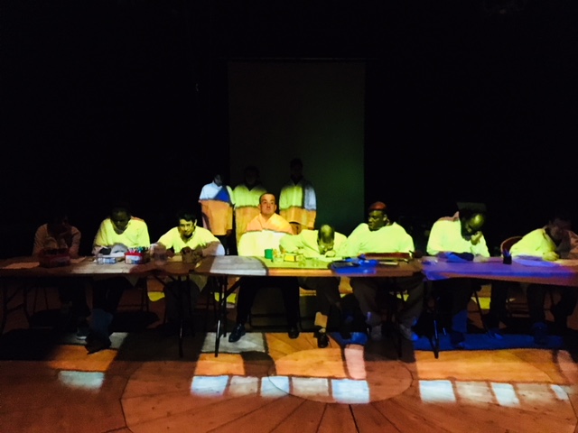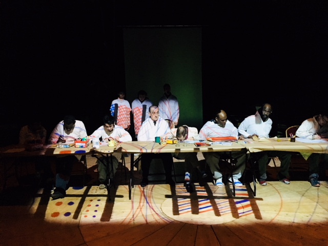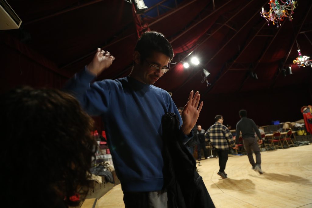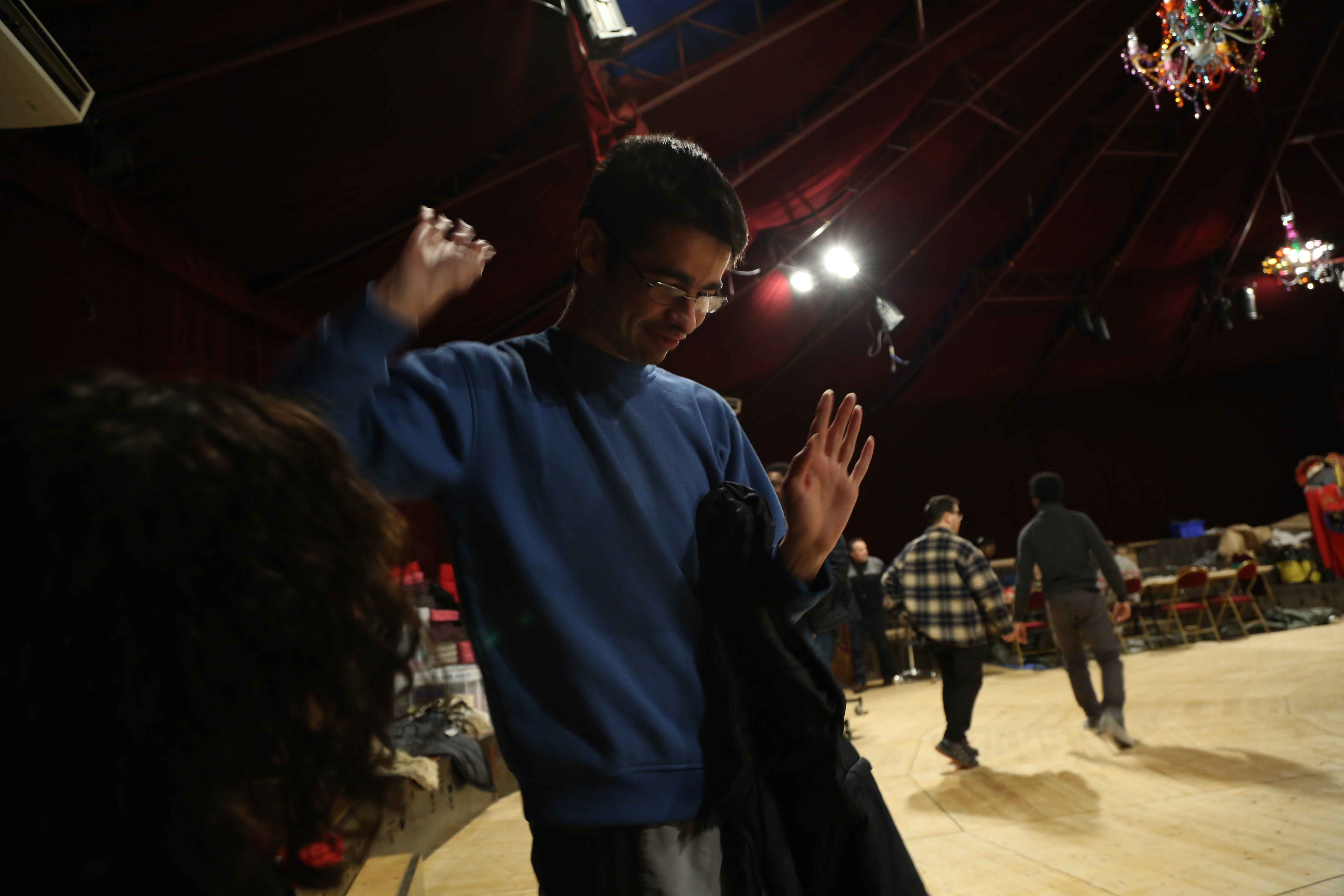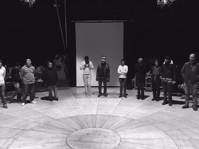 La vie, c’est le mot juste pour décrire ce qui se passe toute la journée dans le grand chapiteau. En plus, des micros-événements, les répétitions sont denses et riches, la matière de plus en plus conséquente et parfois totalement imprévue. Parfois, ça dérape: hier, le son de la musique a emmené tout le monde au côté d’Olivier qui improvisait sur scène et tout le monde a dansé 5 minutes ensemble pour le fun et pour se réchauffer. On a fait pas mal d’improvisation: danse, théâtre, musique, clown, nos ami.e.s Turbulents ont de nombreux talents. Et on a regardé en fin d’après-midi les images des trois premiers jours. Elles sont belles, poignantes, étranges.