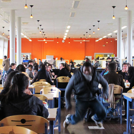 A la cantine à midi, Hervé danse dans la symétrie parfaite du grand réfectoire, au milieu des élèves qui mangent et qui commentent. C’est celui qui danse sans musique, disent-ils. Jérémie filme, bien entendu.