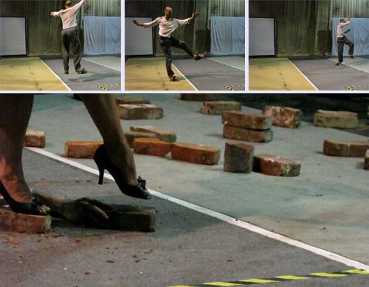 Il y a des briques des briques des briques. Il y des petites blessures. Il y a du talc et de la cendre, du sang et du bleu. Il y a de la corde. De la table. Des talons hauts, un balais micro, des dis-y qu’t’es artiste !