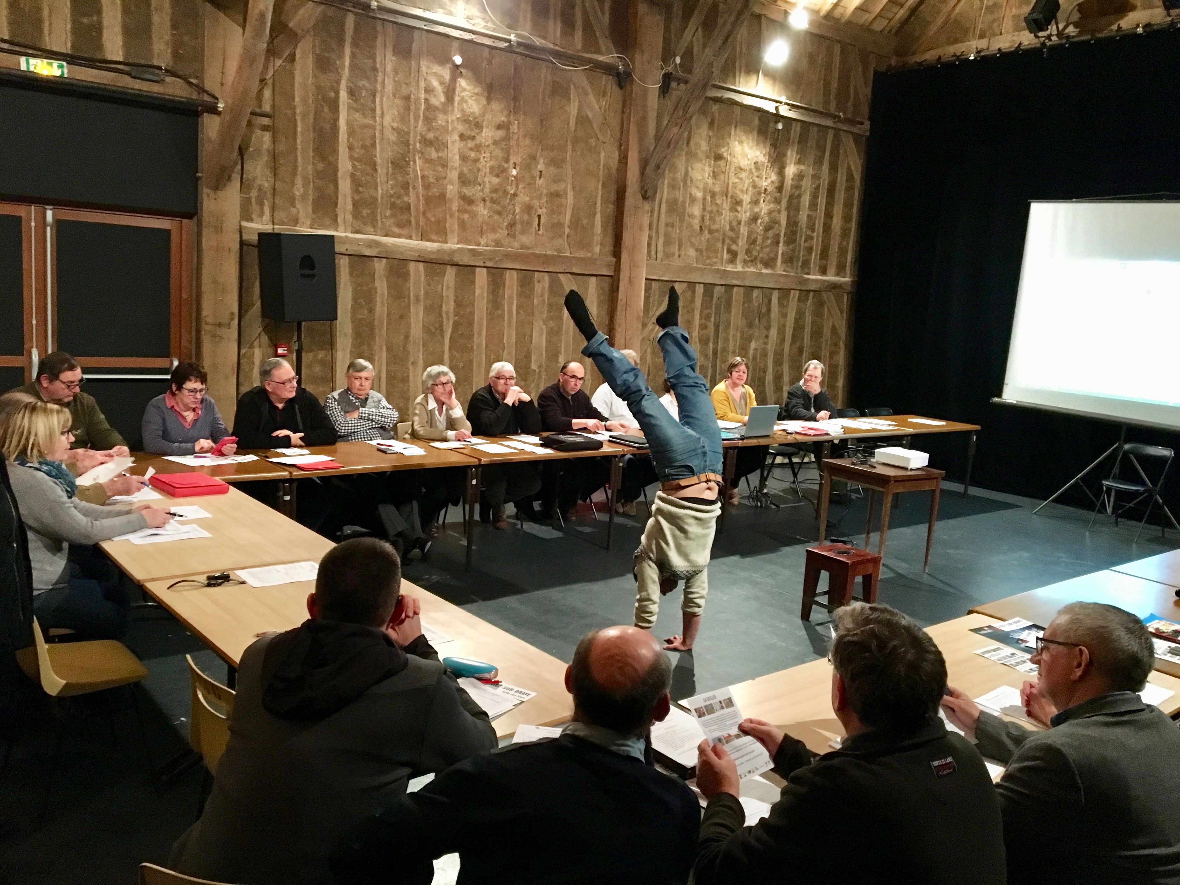 Ce mardi matin, nous rencontrons, pour une conversation filmée, Loïc Tytgat, le directeur de L’ESAT, passionné et accueillant. Il nous raconte comment ça se passe ici, il nous raconte le dispositif « différent et compétent ». On visite les ateliers. Partout, une bonne humeur communicative. On retrouve des personnes qu’on avait rencontrées au cours de théâtre le mercredi soir à l’Échalier, on retrouve des personnes qu’on avait rencontrées le 7 février lors de la réunion publique pour la préparation de la veillée. On parle du film-spectacle. De notre côté, c’est le dernier jour de tournage (parce qu’après il faudra finir les montages pour être prêts pour vendredi) et on a une très belle surprise : Loïc est d’accord pour nous que nous revenions avec les danseurs. On va pouvoir danser, faire des équilibres, jouer du bugle et filmer dans les ateliers de l’ESAT, bref on va avoir des images dans une petite usine, rue de l’industrie à Mondoubleau. Merci.