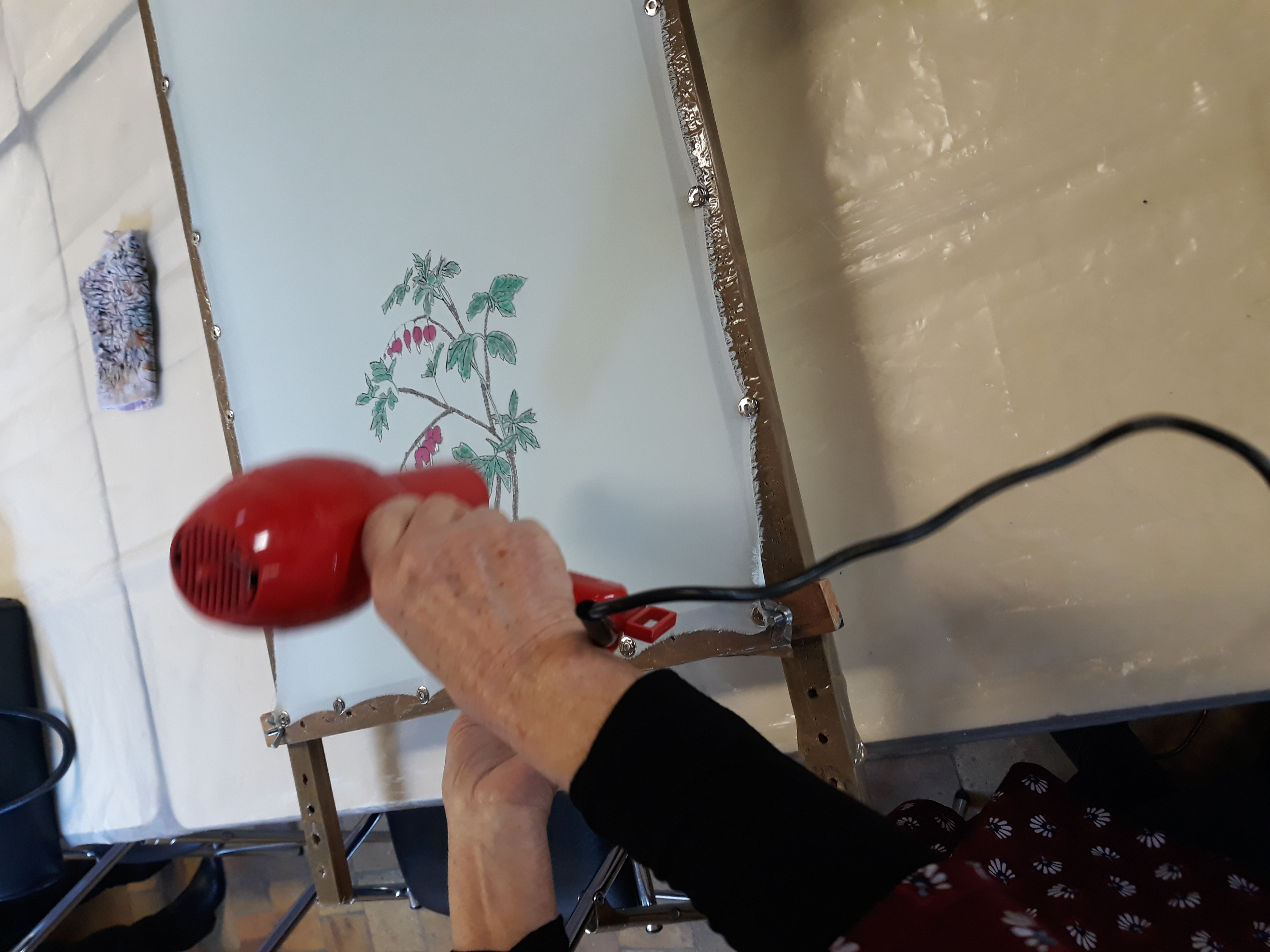 Sur les conseils de Claudine, rencontrée mercredi dernier à la médiathèque, nous avons rencontré tout à l’heure les Doigts Agiles, un groupe de femmes qui peignent sur la soie. Certaines peignent dans des motifs pré-existants, d’autres se lancent carrément dans des dessins originaux à base de bâtons d’encre de chine. Nous sommes attendu.e.s et proposons le protocole des citations. Malgré quelques taquineries, l’ambiance est joviale et l’accueil chaleureux.