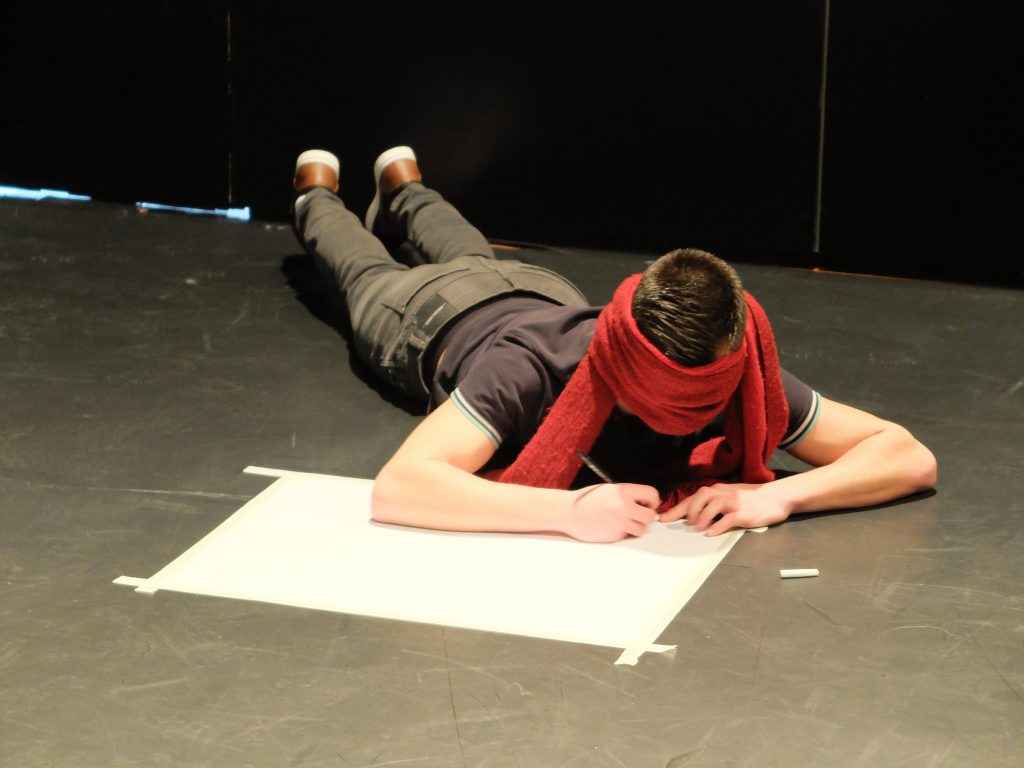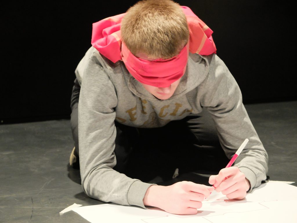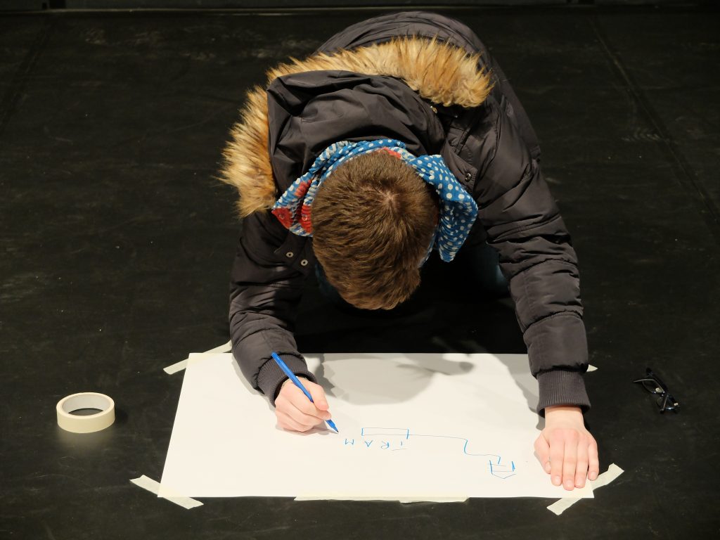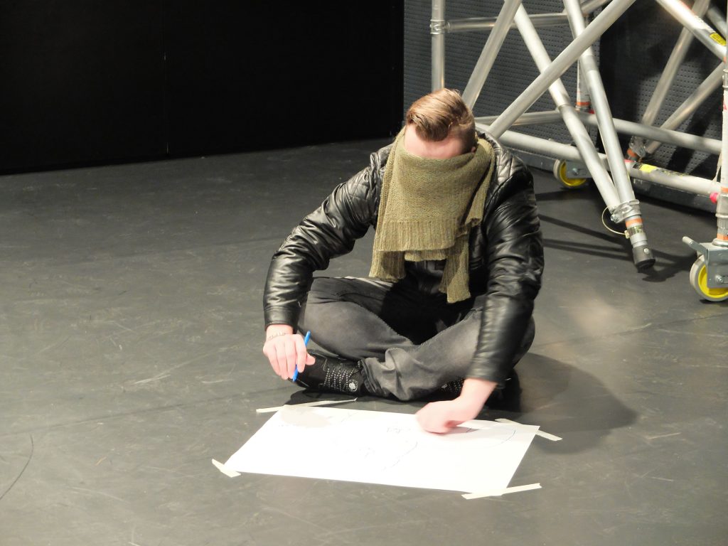 Marie Bouts a demandé aux jeunes de dessiner leur parcours, de chez eux au théâtre, de chez eux aux usines qu’on va visiter dans les jours à venir. Ils ont fait de magnifiques oeuvres, constellées de mots, d’interrogations sur la vie et le monde du travail. Par groupes de cinq ou six, ils ont projeté sur la feuille blanche des directions, des point d’interrogations, des croisements mais aussi des impasses. Et des envies de toutes les couleurs. Ces travaux sont exposés dans la salle de pédagogie, notre quartier général pendant tout le temps de notre présence au Phénix.