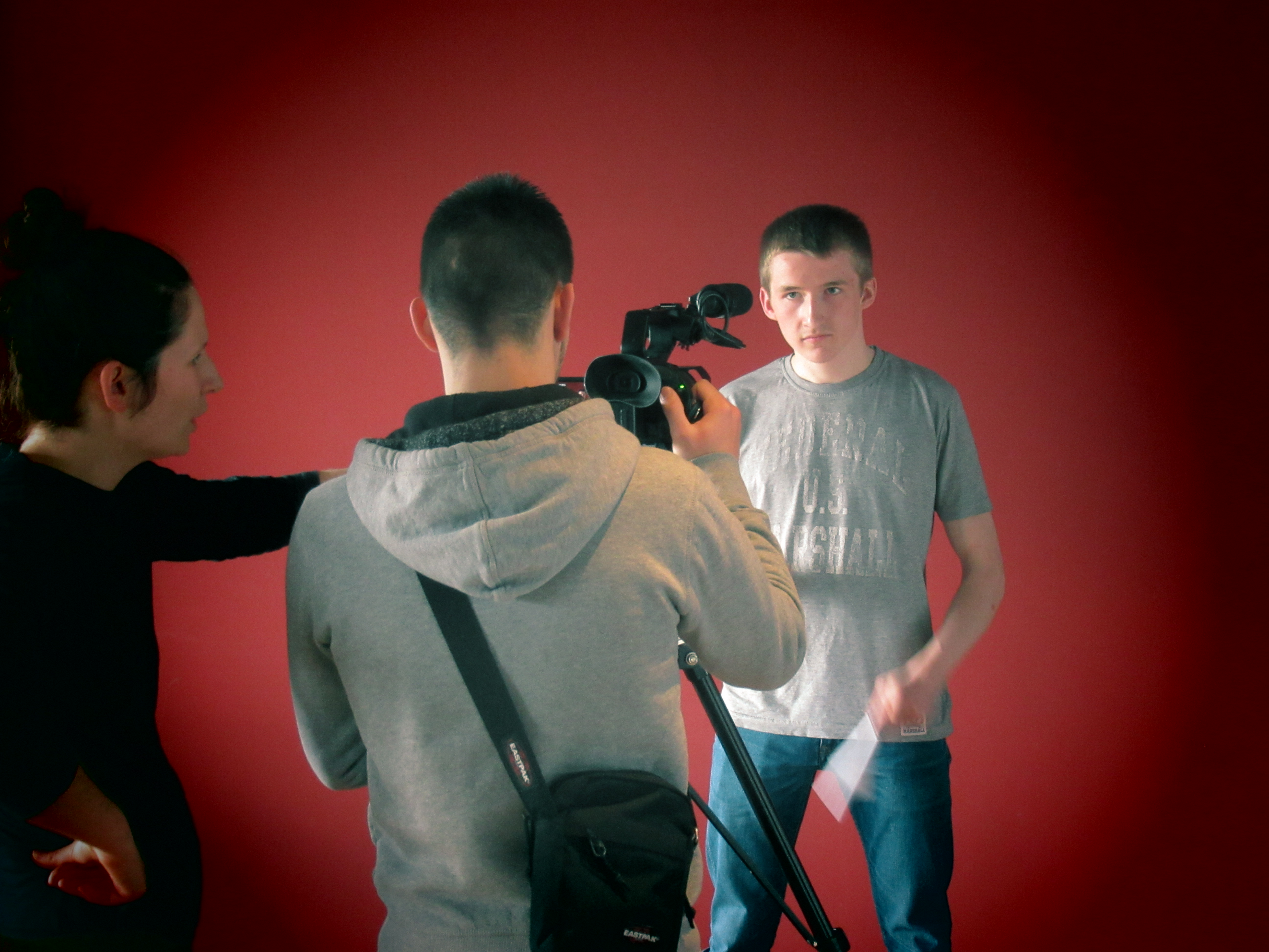 La séance démarre. On butte sur l’enregistrement, à savoir que K. ne voudrait pas qu’on le filme comme nombre d’entre eux. K. ne voudrait pas qu’on voit sa tête. Béné choisit un endroit pour filmer (le mur rouge). D. se place derrière la caméra. Béné lui met un casque sur les oreilles. Martine se place jute à côté de D. Béné est derrière D. K. parle une dizaine de secondes. K. voudrait que nous passions (les membres de la compagnie Hvdz) devant la caméra. On prépare tous un petit texte qu’on apprend par coeur. K. filme B. qui parle presque trente secondes. J. filme depuis le début de notre rencontre tout ce qui se passe dans notre pièce de travail (salle des pédagogies, au quatrième étage du Phénix). Marie K. du Phénix, qui, dans le passé, a travaillé longuement avec Hvdz, passe devant la caméra pour montrer son savoir faire cinématographique. Puis, c’est D. qui joue à son tour devant la caméra. La contrainte de la séquence est parfaitement respectée. On avance bien. Ensuite, on passe à Y. et J. qui ont formé un autre groupe. Y est derrière la caméra. J. est devant. Béné indique à Y. comment régler la netteté de la caméra et le cadre. C’est parfait. On filme et refilme J.. J. dit qu’il n’a rien à dire pendant trente secondes et qu’il trouve ça long. Et on inverse, c’est Y. qui parle et J. qui filme. Ça marche bien. On est arrivé au bout de l’exercice. Maintenant, Marie Lies propose que chacun développe un texte à partir de mots, qu’elle a notés et qui reviennent souvent dans les prises de paroles des un-e-s et des autres.