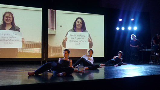 Dernière représentation du film-spectacle de la Veillée cet après-midi, à 15h au centre de loisirs Monseigneur-De Laval, à Beauport. Il a neigé mais ça ne tient pas. On a revu plein de gens qu’on a rencontrés pendant les trois semaines de marche, de danse et d’actions dans Beauport. On espère bien remplir la salle cet après-midi. Il a neigé, la première neige de l’hiver, juste avant la deuxième représentation. Tout le monde s’est collé à la vitre. Tout le monde est sorti. Ça s’en vient, tout doucement, l’hiver. On a eu des longues conversations avec les citoyens de Beauport après les spectacles. Des discussions enrichissantes et enthousiasmantes. Ce soir, on a prévu, toute la gang, d’aller au restaurant. On pourrait retourner au restaurant vietnamien, on peut y amener ses bouteilles de vin, et les mets sont succulents. Si Beauport était un plat cuisiné, ça pourrait être un de ceux-là.