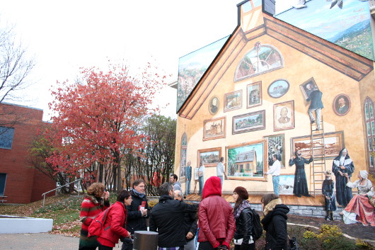 Notre quartier, c’est le Vieux Beauport ! Avec Pierre Drouin et Serge Racine (de la société d’art et d’histoire du Vieux Beauport), et toute l’équipe des Veilleurs de Code Universel et de Hvdz, on a découvert le coeur du Vieux Beauport. On a vu la rue du Couvent, construite par un ferblantier du début du 20ème siècle, les enfants jouaient à remonter toute la rue en passant d’un grenier à l’autre. Les toitures en tôles réalisées en 1910 sont conservées à l’identique depuis leur installation. On a vu une maison blanche en planche de boue. Il y a avait un cours d’eau qui passait entre la maison blanche et la maison rouge (ce qui, par le passé, a provoqué des inondations). On a vu une maison brune qui a été bâtie à l’endroit où on attachait les chevaux quand on allait à la messe. On n’a pas cessé d’agrandir les églises du quartier tant il y avait de monde à la messe. Jusque dans les années 1970. La maison bleue et jaune dans l’avenue royale appartenait à un pâtissier célèbre grâce à ses bonhommes en pain d’épice. On a vu la maison Girardin au milieu d’un parc éponyme. Dans cette maison, on remisait les valises des pensionnaires de l’école crée par les soeurs du couvent. L’école était destinée aux filles car les garçons étaient emmenés très tôt aux travaux des champs. Les gens de Beauport étaient essentiellement des cultivateurs. Les terres cultivées se trouvaient par delà la rue des Cascades. On a vu que, sur un même terrain, on construisait souvent une deuxième maison, derrière la première. Il faut savoir que dans Beauport on a souvent déplacé des maisons. Les maisons voyagent dans Beauport. On appelle les gens de Beauport, les oignons de Beauport (on y cultivait des oignons français, des échalotes). Serge et et Pierre nous ont raconté des anecdotes savoureuses sur leur vie dans le quartier qui est leur passion.