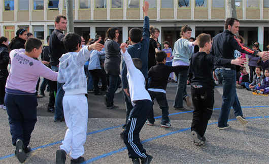 Cet après midi les troubadours sont allés à l’école de la colline, pour danser dans la cour. Depuis les fenêtres du QG, la salle photo de la MJC, on les voyait danser. On voyait les enfants qui étaient en cour de sport sur le terrain d’à côté s’agglutiner contre le grillage. On a vu les enfants essayer des chorégraphies, faire l’adage. Des enfants enthousiastes. les troubadours ont pris beaucoup de plaisir à échanger avec ce public vivant et affectueux.
