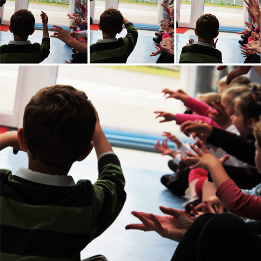 Intervention à la maternelle de Hinges. On est bien accueillis par une directrice qui organise bien tout en deux temps trois mouvements. Pas de récré dehors à cause de la pluie, c’est pas grave. Récrés décalées, pour les moyens, puis les petits avec les grands. Hervé improvise une intervention où il fait faire la vague à tous les enfants. Une vague de petites menottes qui se rejoignent et puis repartent, au milieu du carré bleu.