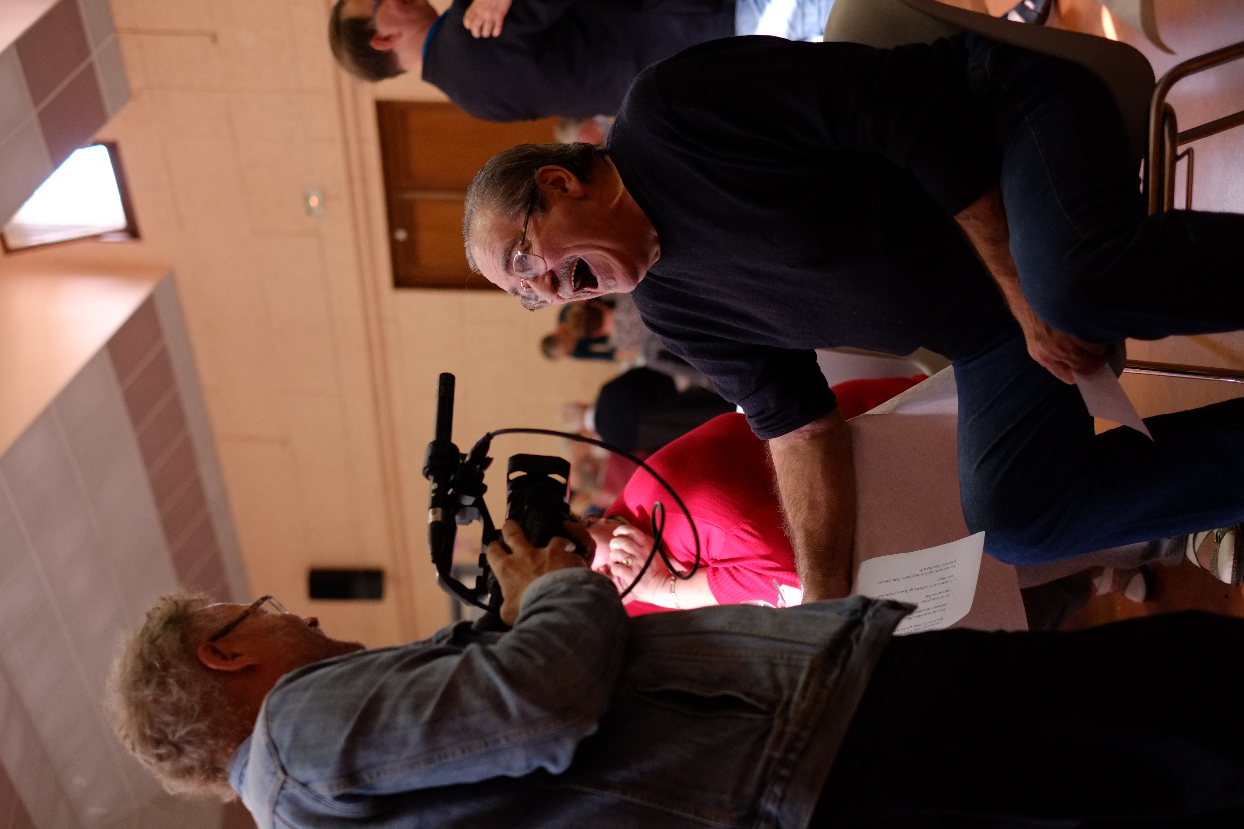 Il y avait les élèves de l’école de Chalmazel : ceux de la classe de Madame Dupuy, la classe qui est à Chalmazel (les CP, CE2, CM1 et CM2), mais aussi les élèves de CE1 qui sont dans la classe de Madame Brun qui est, géographiquement parlant, à Saint-Georges-en- Couzan et qui sont spécialement montés à Chalmazel pour le film-spectacle. C’était beau de voir comment ils ont été happés par toutes les séquences du film : des interviews aux pas-de-portes, en passant par les travellings, les images filmées par le drone et les moments dansés par Mourad. On a eu l’impression que leurs yeux se sont arrondis encore un peu plus, si c’est possible, pendant la séquence « En attendant Godot », qui avait été filmée dans leur école lundi et où ils ont chacun joué Estragon qui se met en colère contre Vladimir.