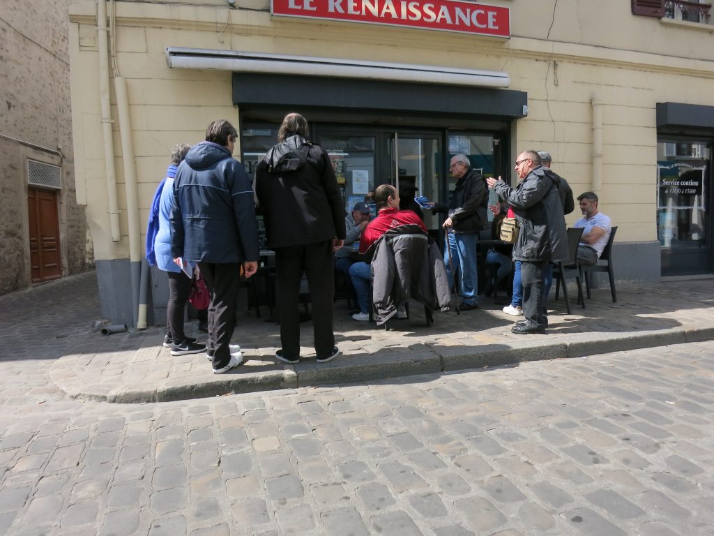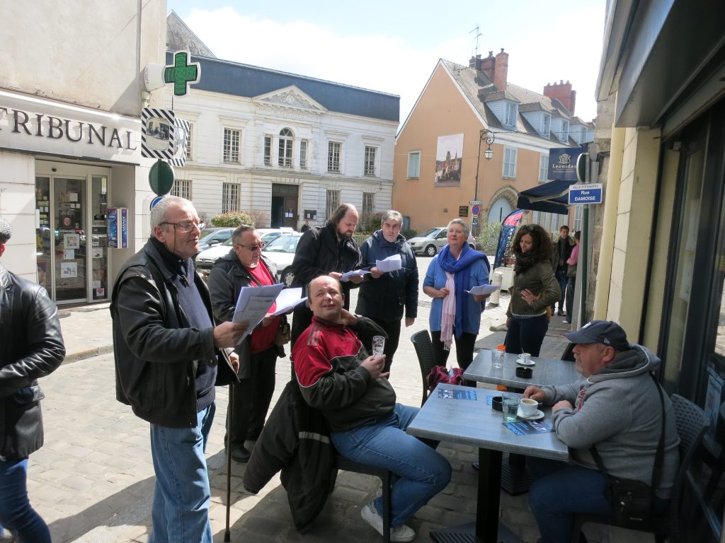 Cet après-midi, on est allés offrir des chansons aux gens dans Étampes. On a commencé par entrer dans un café. Pour certains veilleurs éphémères, c’est une occasion à ne pas rater. Entrer dans un café. Ça n’a l’air de rien, mais la mise en place du plan vigipirate, ça change beaucoup de chose. Pour Michel : les sorties dans les cafés, qui avaient lieu tous les jeudis, c’est fini depuis vigipirate, c’est fini depuis plus de 2 ans. Alors, quand on va chanter nos premières chansons de l’après-midi dans un café, Michel en profite pour commander un cappuccino. Café, chantilly, sucre. Et Michel aime chanter, alors, même avec le cappuccino à main, il continue à chanter et à sauter pour marquer le rythme dans « Yellow submarine ». Il le boit vite son capuccino, parce qu’on ne reste pas assez longtemps pour qu’il refroidisse. Il boit vite même si c’est trop chaud. Pour le deuxième « lieu-chansons », on est à nouveau dans un café. Michel commande rapidement un nouveau cappuccino. Café, chantilly, sucre. Encore une fois, il est obligé de la boire vite, mais il n’a l’air pas contrarié pour autant. En sortant du café, on lui demande s’il ne s’est pas brûlé. Michel nous explique que c’est chaud dans la gorge, mais ça lui manque tellement les cafés qu’il en profite et que ça lui fait plaisir. Il aurait sûrement pu boire encore quelques cappuccinos, mais on varie les commerces, et là on entre dans une petite épicerie. On repart avec des jus de fruits de fruit en cadeaux, mais on a bien l’impression que Michel s’y intéresse moins et qu’il garde en tête ses deux cappuccinos.
