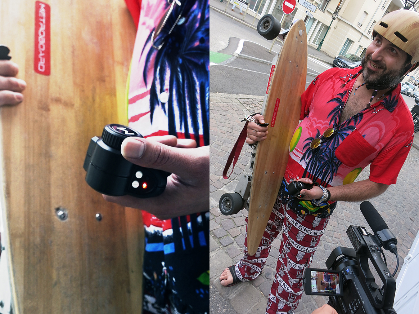 On frappe aux portes. On propose à celui qui nous ouvre de fabriquer avec nous la séquence des objets : montrer un objet qui est important pour lui, raconter son histoire. Voici parmi les objets qu’on nous a présentés, le skate-metroboard- brushless, son moteur magnétique et sa télécommande à ondes radio. Des pointes de vitesse à 30km/h. Genève est ainsi à 45 minutes, par pistes cyclables et trottoirs. À noter quand même, apparemment, les pistes de cyclables de St-Ju, c’est pas terrible. Le skate-metroboard- brushless, c’est : pas de souci d’assurance, pas de souci d’essence, pas de souci d’embouteillage. La liberté. Le moteur s’auto-recharge au moment des freinages. Et, quoiqu’il arrive, assez d’autonomie pour faire l’aller-retour Saint-Julien – Genève.