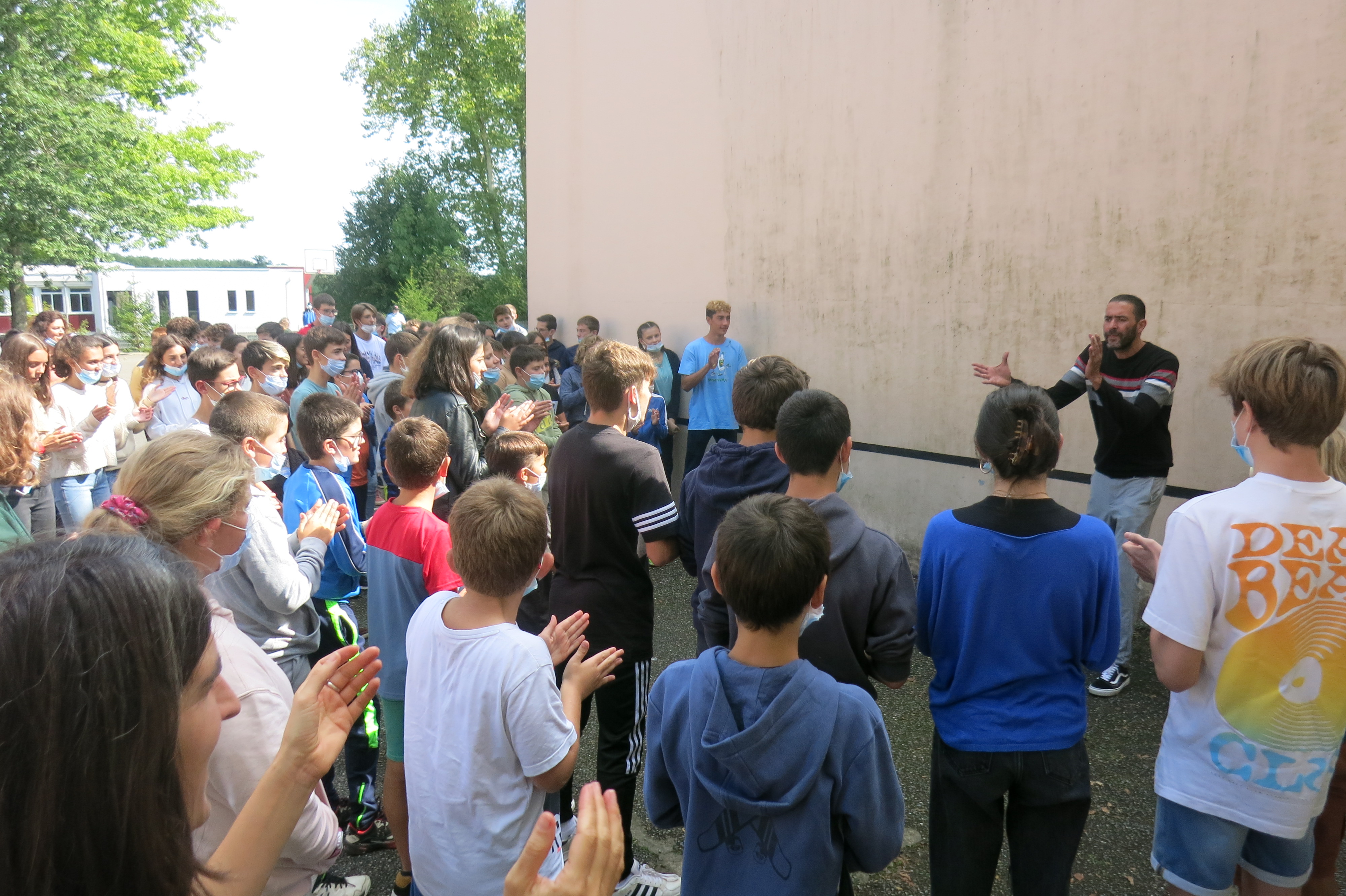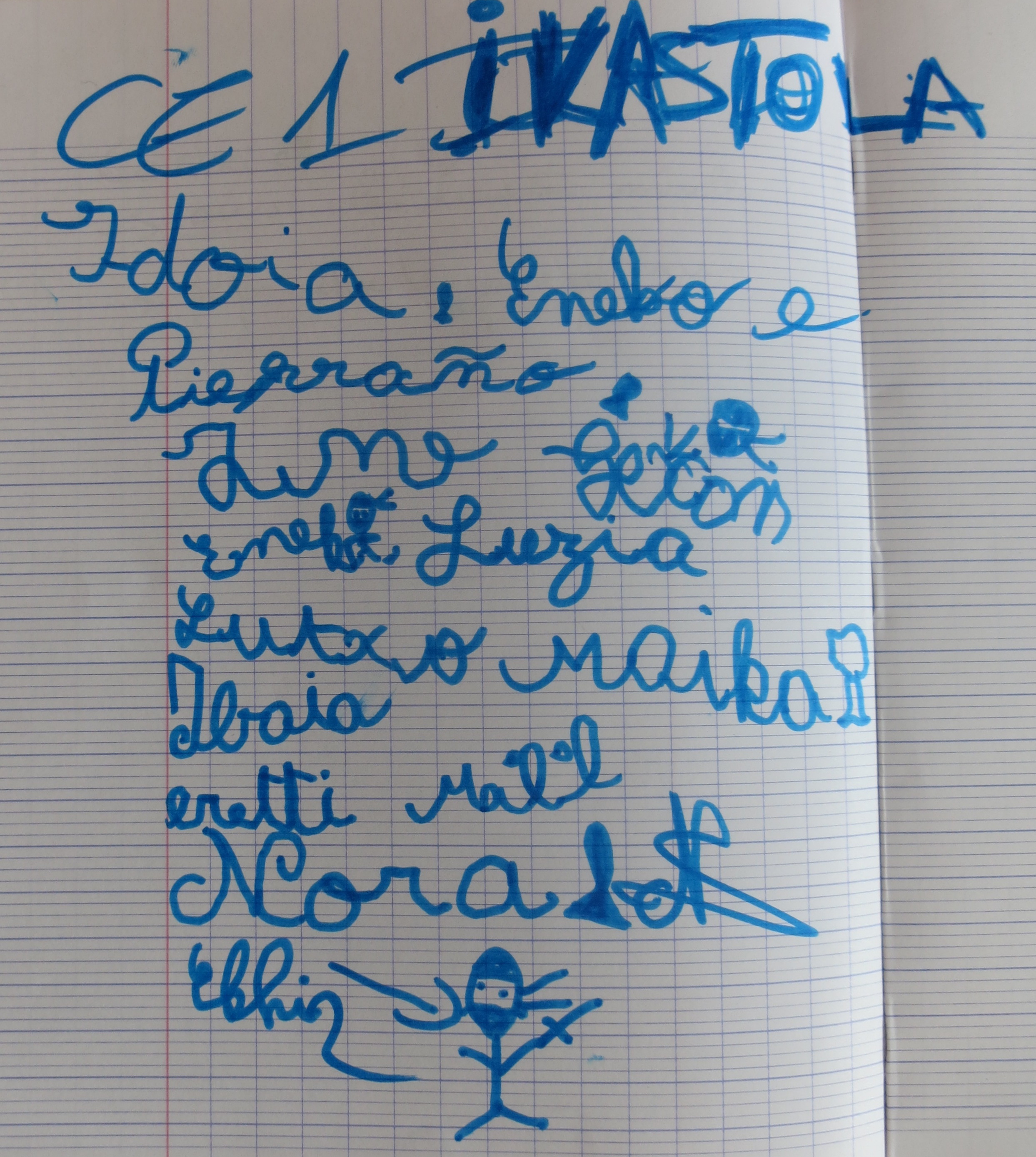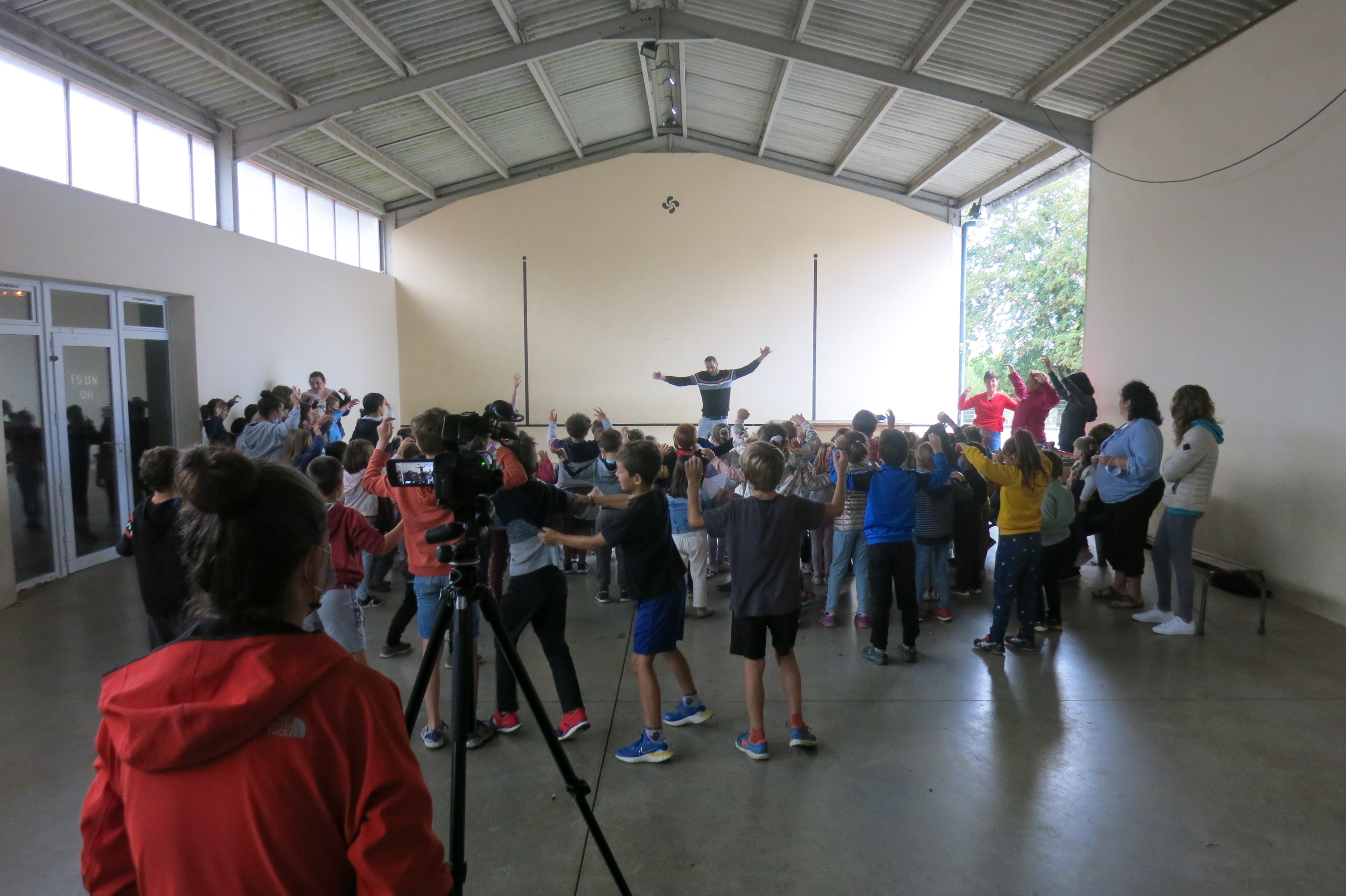 De retour au Q.G pour la deuxième partie du Portrait des gens de St Palais. On a tous bien profité de notre journée off pour se balader dans la campagne dont Mourad qui a erré pendant plus de trois heures sur les chemins des alentours. Il est rentré à l’orée de la nuit. Mourad est un très grand marcheur. Il marche dès que l’occasion se présente plutôt que de prendre la voiture. Il est allé rejoindre ce matin ses collègues à l’Amikuzeko Ikastola à pied pour danser et jouer En attendant Godot en Basque, c’est-à-dire Godot Igurikatzean. Avec Maryse, Bénédicte et Isabelle. Maryse pratique la langue basque couramment et donnera la réplique aux jeunes de l’école immersive basque de Saint-Palais. Julie et Johanna de l’agglo sont parmi nous.