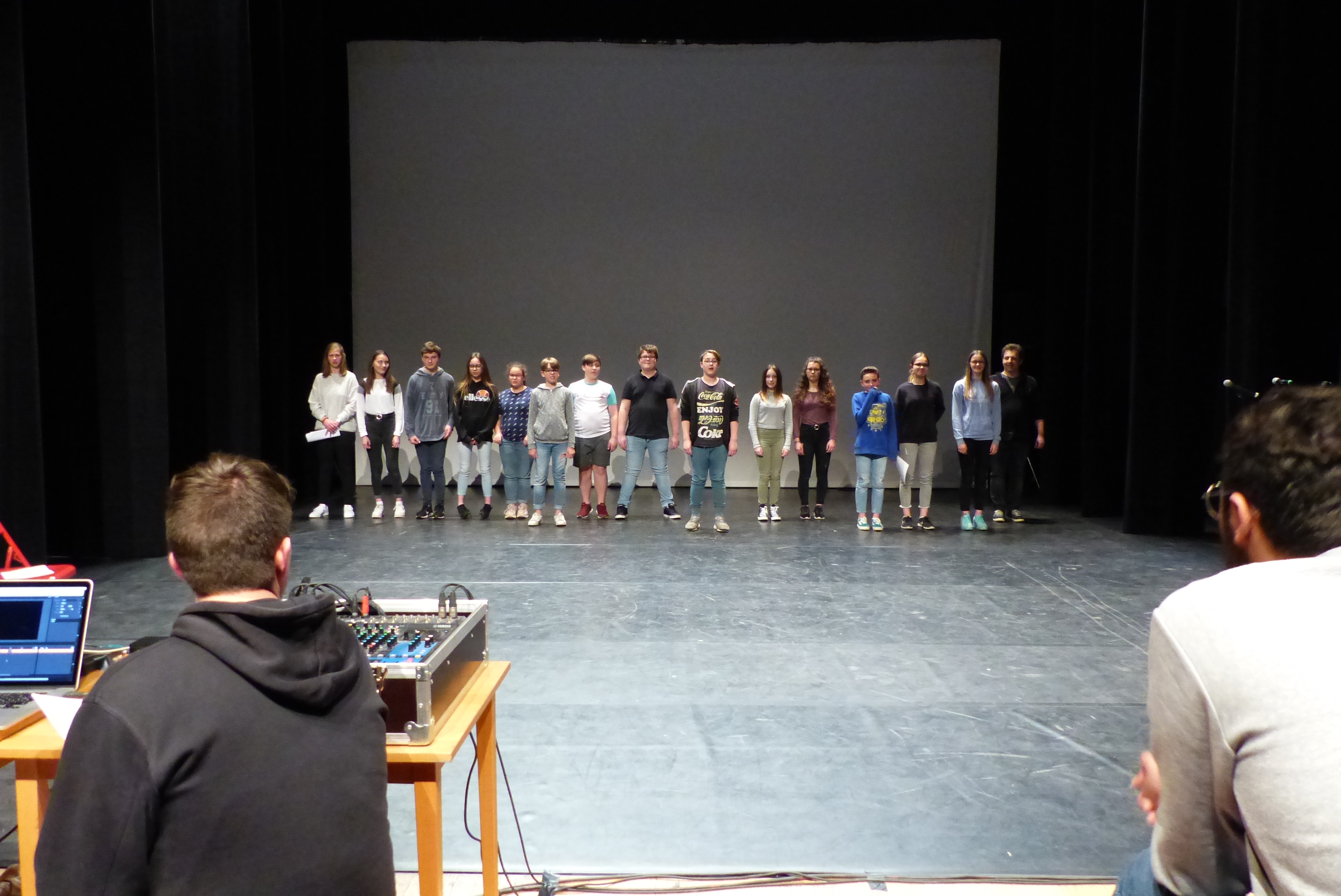 Une séquence du film-spectacle Close To Me à Culture Commune. Pendant la première semaine de travail, en février, à propos du vivre ensemble, les jeunes s’étaient prêtés à plusieurs ateliers d’écriture. Et notamment, ils avaient répondu à la question : Qu’est-ce que vous ne supportez pas ? Et pourquoi ? Là, sur le plateau, pour cette séquence, ils sont en ligne, partent du fond et avancent quand ils parlent. Ça, ça va. Ce qu’ils trouvent plus déstabilisant, c’est qu’on n’a pas fixé l’ordre pour les prises de paroles. Alors, il faut être à l’écoute, ne pas partir à deux en même temps, ne pas laisser de blanc, faire avancer la ligne au fur et à mesure des 45 interventions. En voici quelques unes :