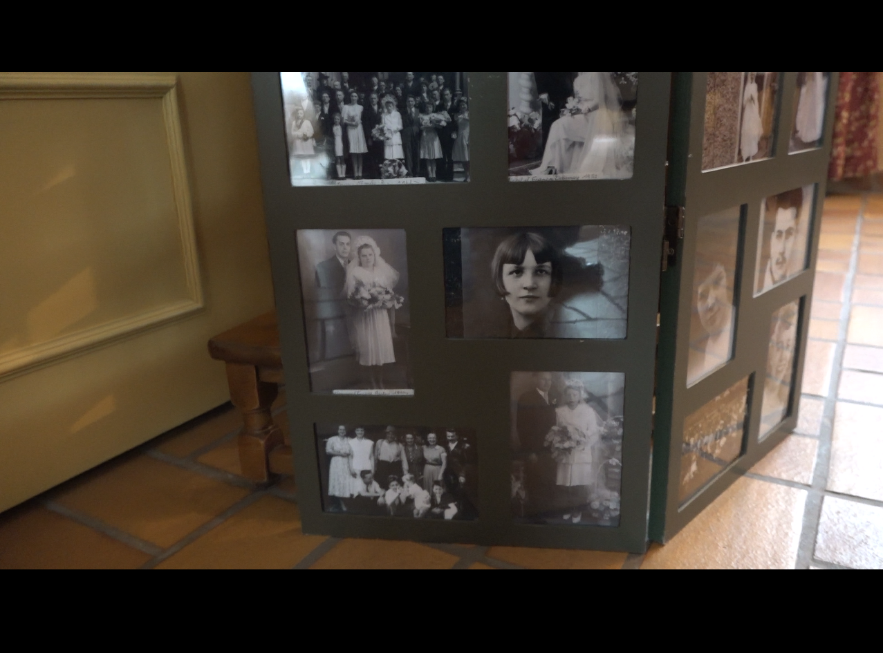 • Le paravent : Moi j’en rêvais d’un paravent à photo, alors quand je l’ai trouvé, je l’ai acheté. Il était un peu abimé mais mon mari l’a réparé, et mon fils a rapetissé les photos pour que ça rentre. Là c’est mes grands-parents paternels, et les autres en buste c’est mes grands-parents maternels, ils se sont mariés en 1903. Mes grands-pères ont été appelés à la guerre, ils avaient déjà une famille, ils avaient déjà quatre enfants quand ils ont été rappelés au front.