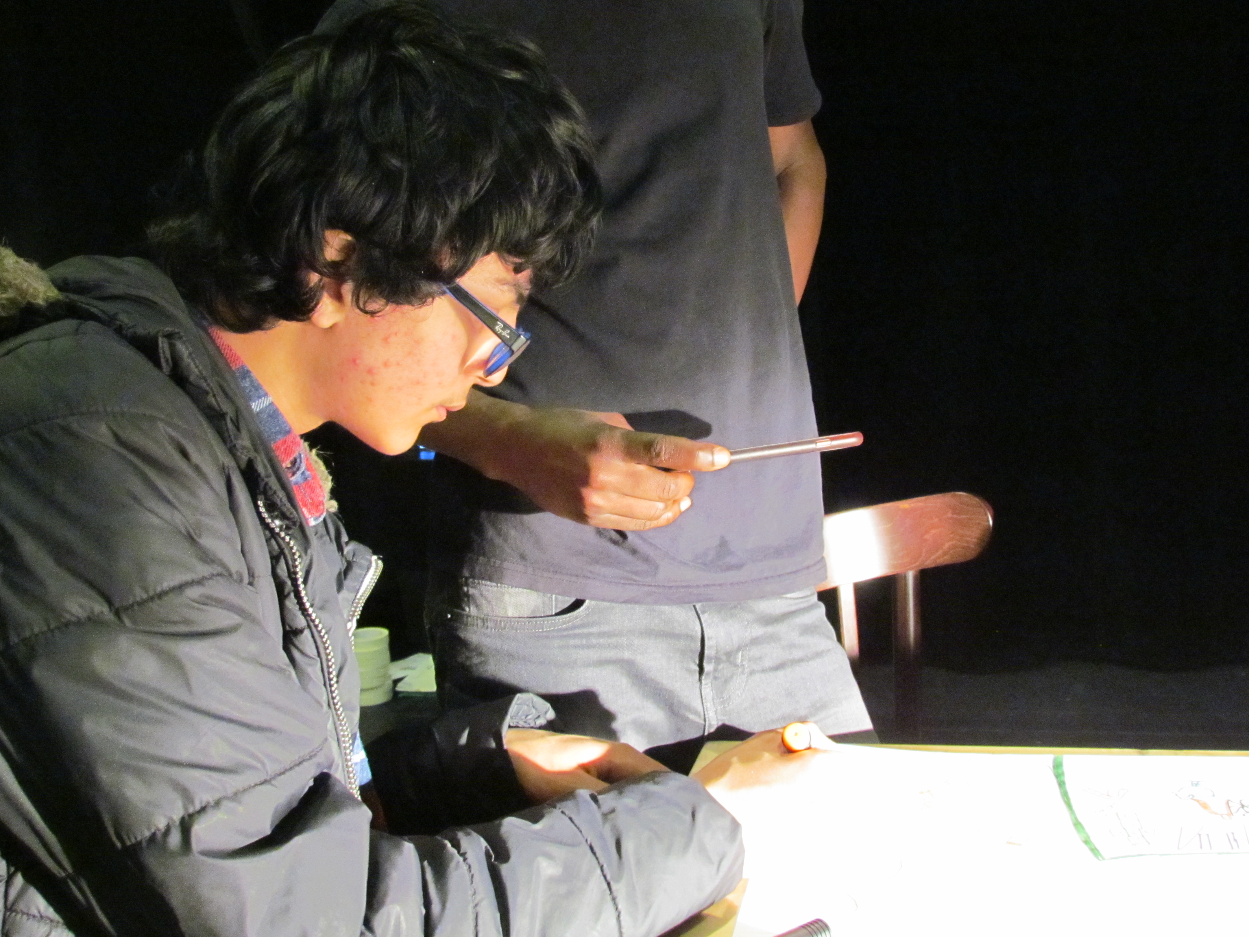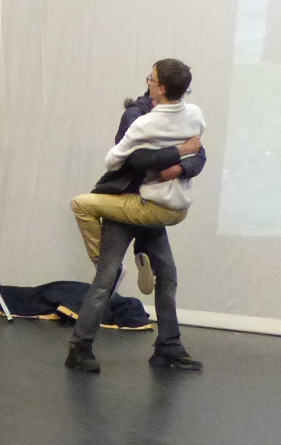Ce matin, dans la grande salle, le plateau est occupée par « la technique », alors on va tous dans la petite salle. Entre les jeunes Close To Me et les HVDZ, les Culture-Commune, les Compiègne, les Grand-Bleu, il faut embarquer plus de 40 chaises, imprimer plus de 40 textes. Après les présentations (j’ai 12 ans – j’ai 13 ans – j’ai 14 ans – je suis en 1ère – je fais du diabolo – je fais de la danse – j’ai fait de la barque la semaine dernière – les filles sont compliquées) et le point sur la conduite du spectacle, on replie les chaises pour un samouraï façon Théo et puis arrive le moment de la danse collective. (La danse collective, ce sera la dernière séquence du spectacle. ) La danse collective. Et voilà, c’est parti. Transmission, concentration, rires, re-concentration, danser ensemble, sentir le groupe pour essayer d’être tous dans un même mouvement, concentration. Revient en tête une phrase dite il y a quelques semaines : « danser ensemble, c’est aussi parler du vivre ensemble ».
