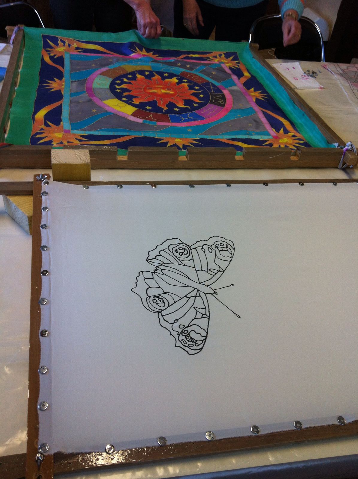 Sur les conseils de Claudine, rencontrée mercredi dernier à la médiathèque, nous avons rencontré tout à l’heure les Doigts Agiles, un groupe de femmes qui peignent sur la soie. Certaines peignent dans des motifs pré-existants, d’autres se lancent carrément dans des dessins originaux à base de bâtons d’encre de chine. Nous sommes attendu.e.s et proposons le protocole des citations. Malgré quelques taquineries, l’ambiance est joviale et l’accueil chaleureux.