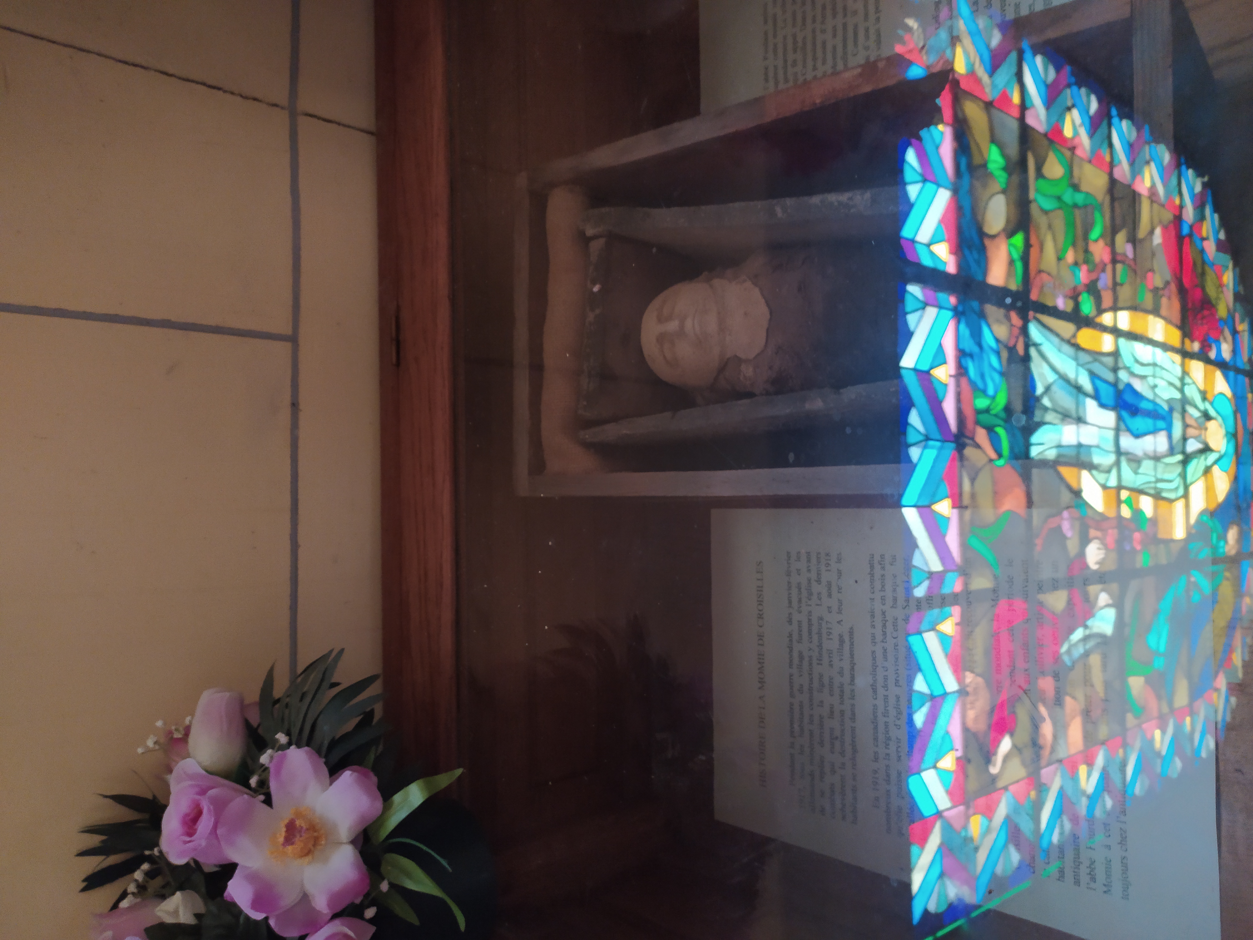 Depuis que nous sommes arrivés à Croisilles (et même avant!), on nous parle de la momie de l’église, cette église qui a été construite sur l’emplacement d’un château, puis qui a été détruite pendant la 1ère guerre mondiale puis reconstruite, quasi à l’identique. Autant vous dire qu’on s’est imaginé plein de choses. D’abord, samedi, on a su qu’on pouvait aller la voir en demandant la clé à Madame Garbez. Puis François nous a expliqué qu’elle serait arrivé à Croisilles en même temps que du matériel qui a servi à la reconstruction de l’église. On a eu un peu plus de précisions de la part d’Alexis : c’est une momie vieille de 300 ans avant JC, ça ne serait pas une momie princière auxquelles on ne brisait pas les os et celle-ci n’a pas de pied. Mais on ne sait pas pourquoi elle était dans ce contener de matériel en 1919 et encore moins comment avant ça elle est arrivée au Canada !