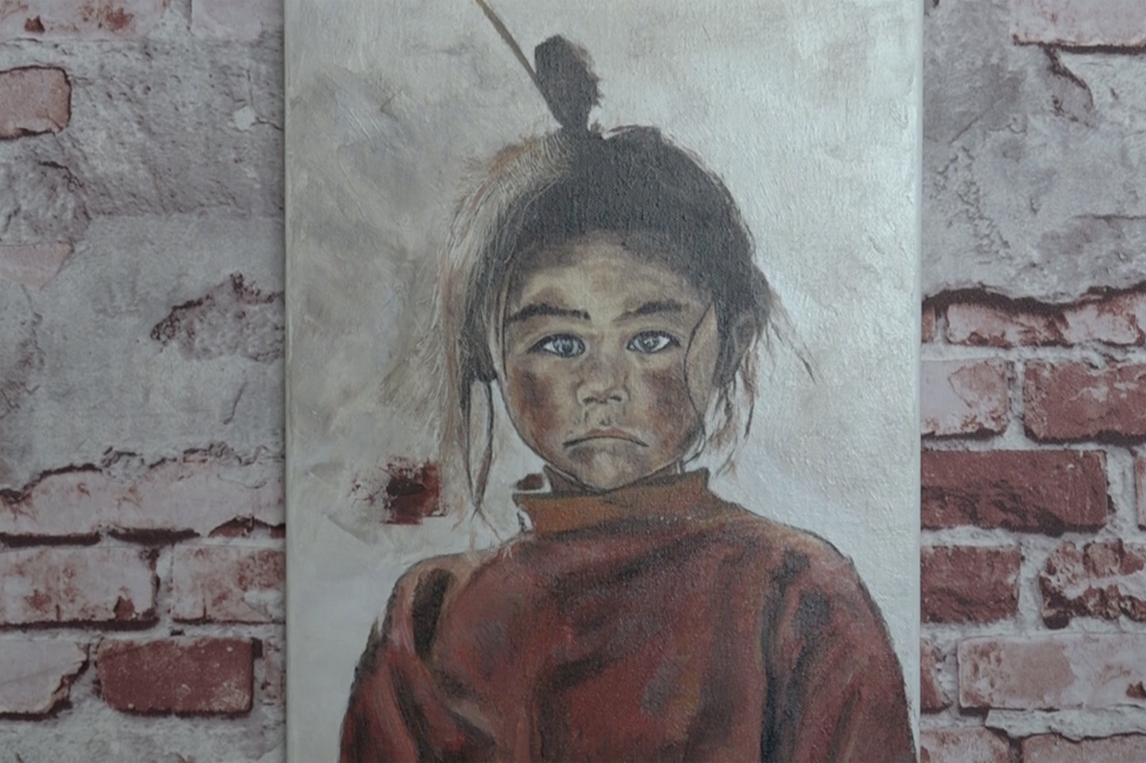 . Tableau d’une jeune fille. Un des tableaux que j’ai peint. Celui-ci je l’aime beaucoup. C’est une jeune fille qui vit dans des conditions très dures en Amérique du Sud. Et qui en fin de compte vit de tout ce qu’elle trouve. C’est pourquoi la plupart du temps, ces jeunes filles ont un visage un peu marqué, un peu sali. J’ai peint ce tableau là il y a 3 ans. C’est une image qui m’a plu et que j’ai peinte à la peinture à huile. Je la trouve tellement expressive, je la trouve magnifique, donc j’ai tenté de la peindre.
