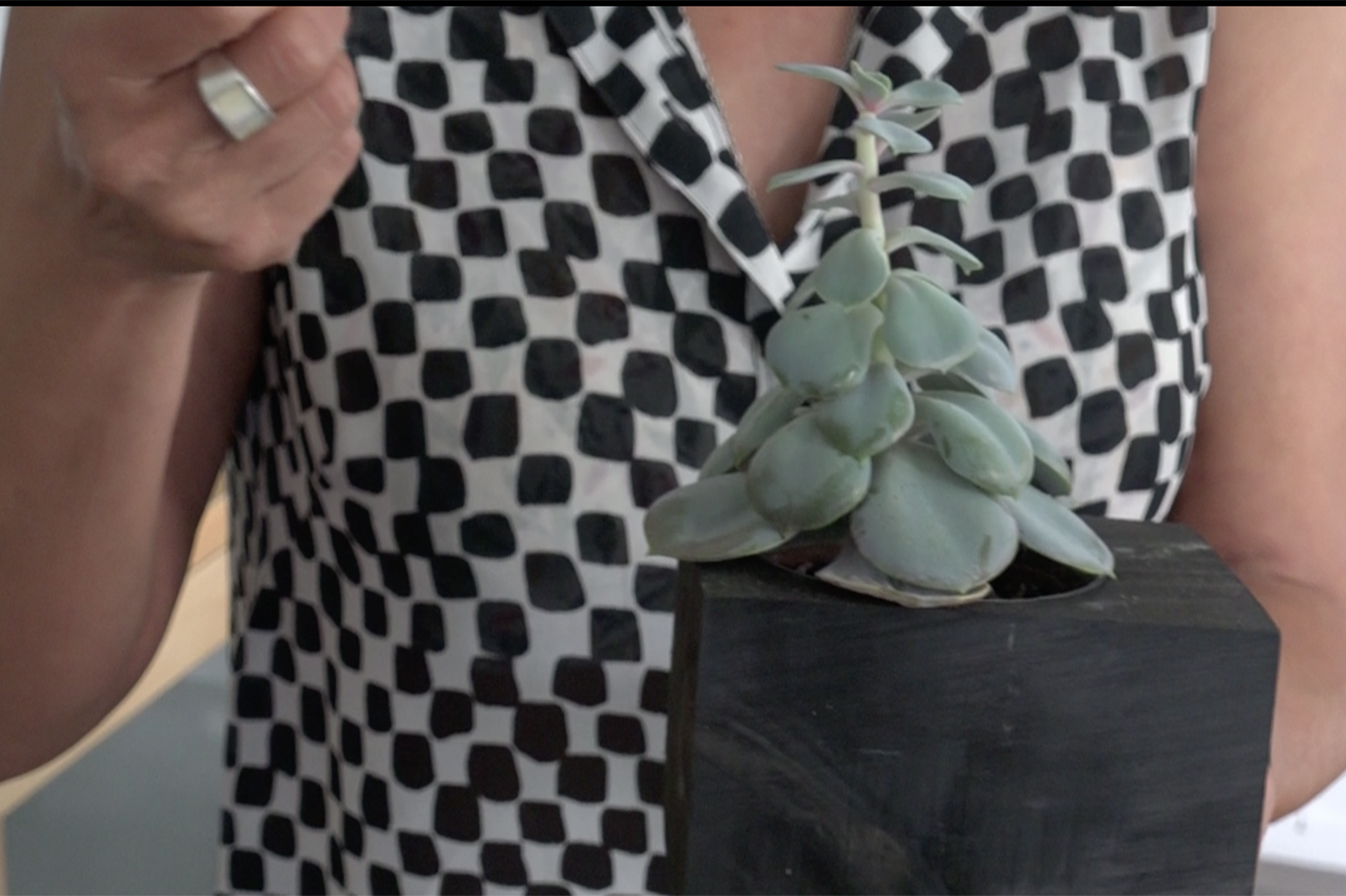 . La petite plante grasse. Une petite plante grasse qui m’a interpellée quand je l’ai vue. J’ai une passion pour les plantes et surtout le potager. Vous voyez sur mon balcon, j’ai des tomates qui poussent, j’ai plein d’aromates. Cette plante : je trouvais très joli le fait que ce soit du recyclé, dans du bois. J’aime tout ce qui peut être recyclé, réutilisé, je trouve qu’il y a beaucoup de gâchis, beaucoup de choses qui sont jetées parce qu’elles sont cassées parce qu’on donne pas la peine de réparer, ou éventuellement de donner : il y a des gens qui aime bien retravailler ou retransformer les objets. Et je trouve que le recyclage, la plante qui naît, qui meurt, c’est tout un cycle.