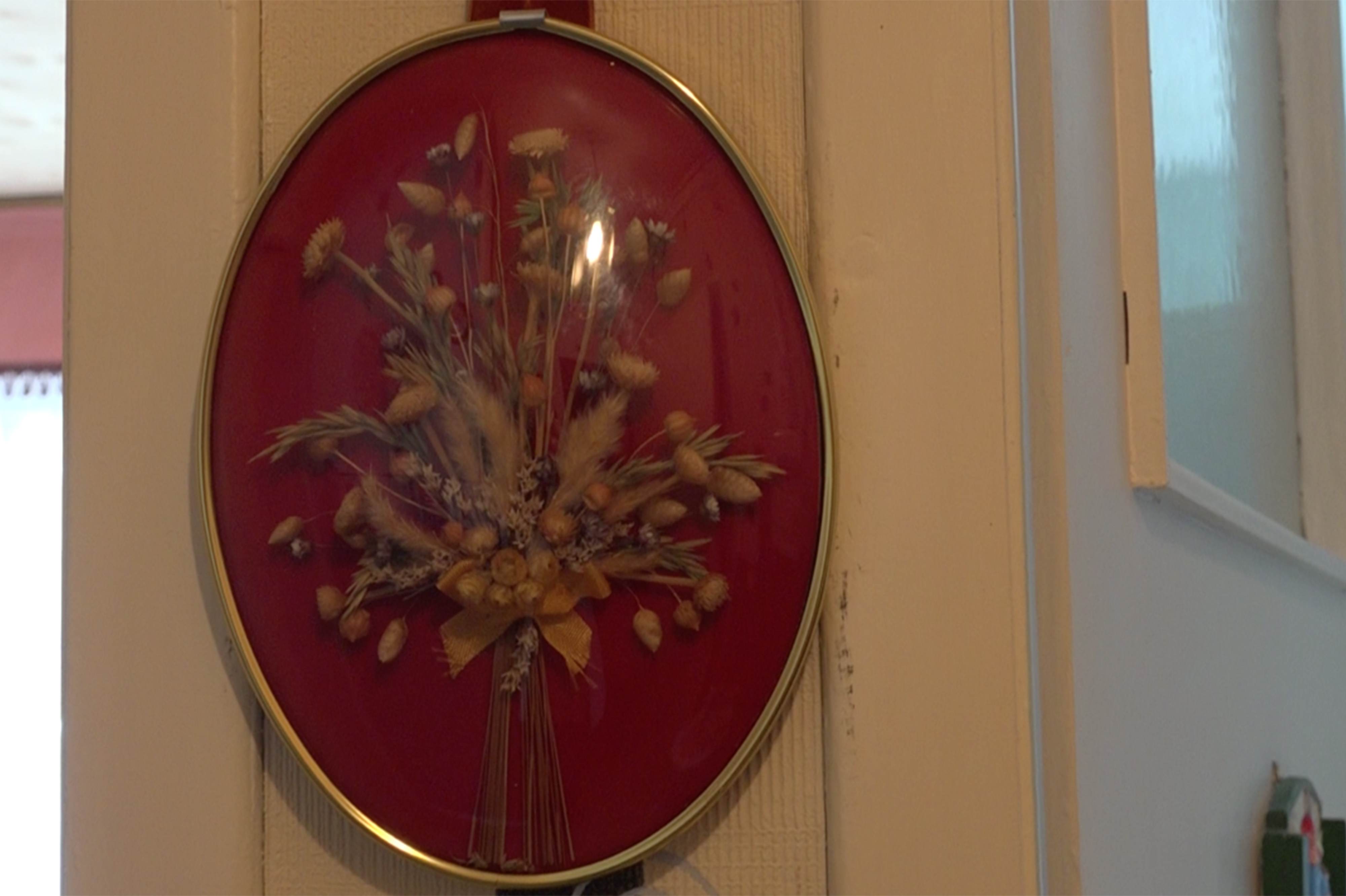 . Le médaillon. C’est objet vient de Lillebonne en Normandie. C’est des petits épis. Je l’ai depuis au moins 45 ans. Il a fait plusieurs maisons. Il m’a suivit dans 5 maisons. Il m’a plu, je l’ai gardé et il tient toujours le coup.