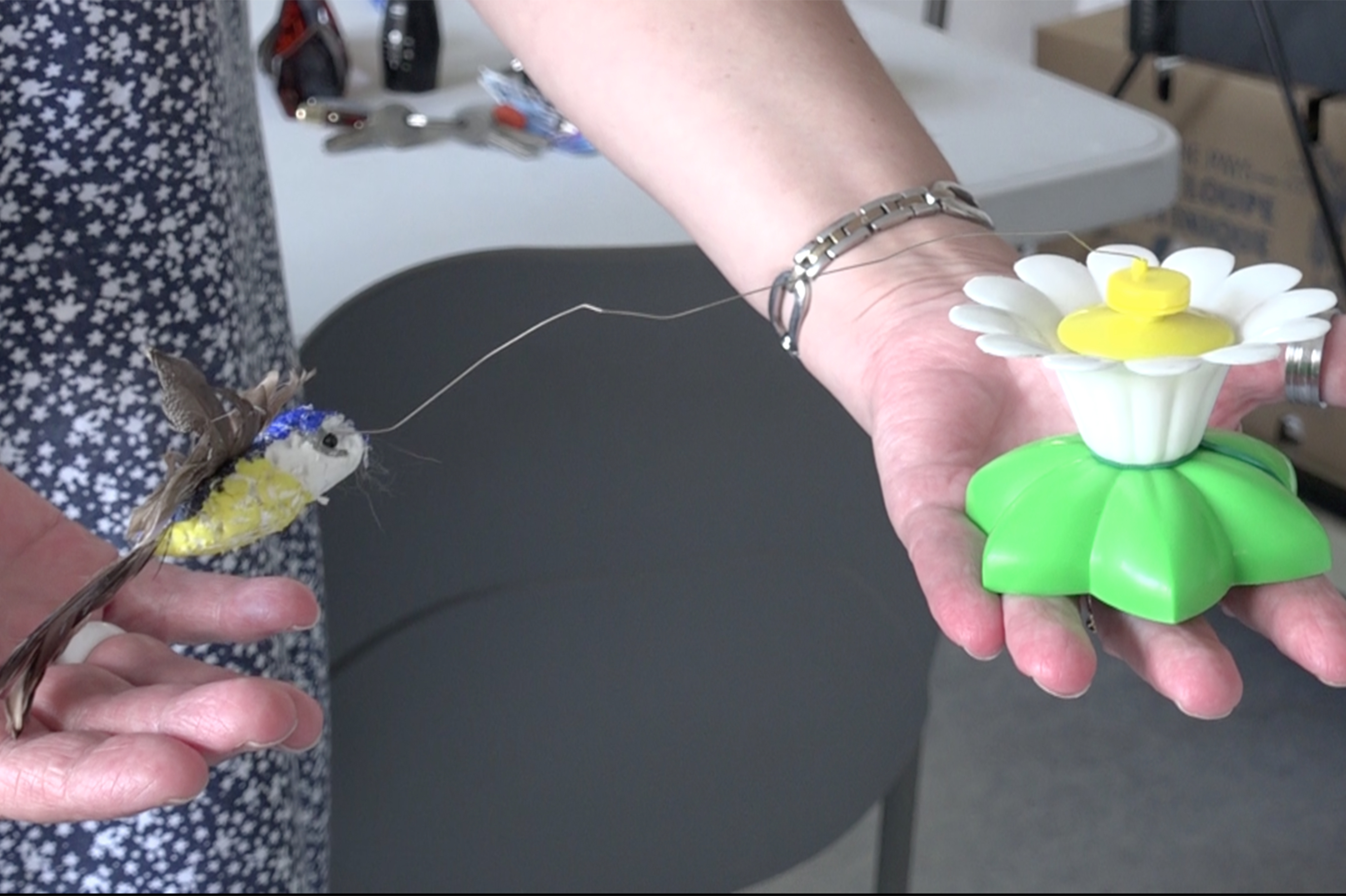 . Un oiseau sur sa fleur. C’est un objet qu’on a acheté pour notre chat parce que notre chat c’est notre bébé. Ça fait au moins deux ans qu’il a cet objet. On a trouvé cet objet sur internet, on a cherché pour lui. Ça a été une réussite, il joue avec : il y a une pile et ça tourne et elle joue avec, elle attrape l’oiseau. Bon, maintenant, elle s’en occupe moins parce qu’elle a 6 ans, elle est un peu moins joueuse.
